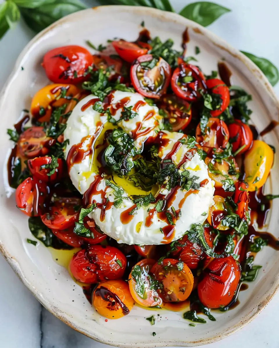 The visual appeal is every bit as important as the taste. The vibrant colors of the roasted tomatoes contrasting with the creamy white of the burrata will make this a centerpiece at any gathering.