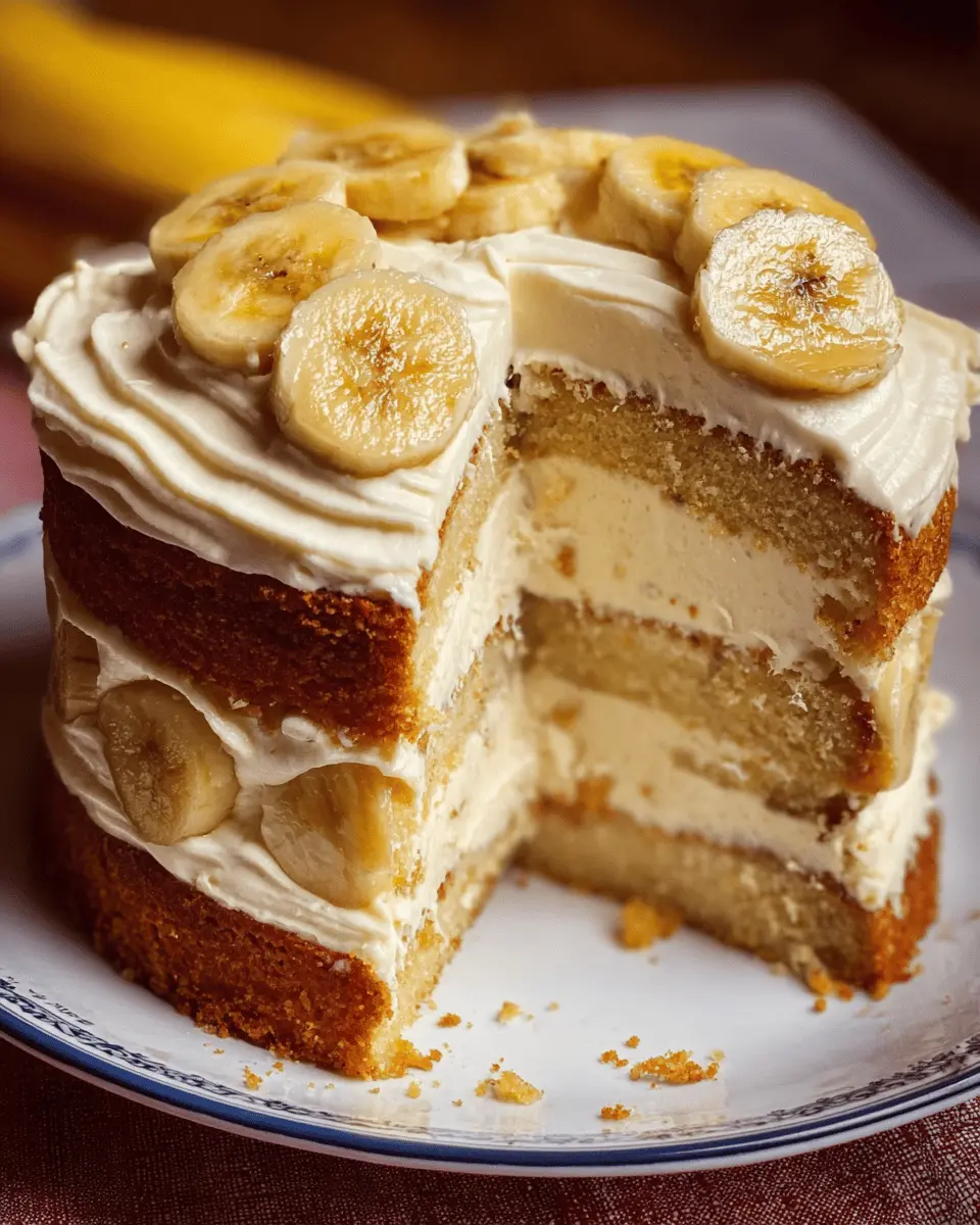 Finally, frost the entire cake with your cream cheese frosting, ensuring it’s as smooth as possible. You can even decorate the top with fresh banana slices or vanilla wafers for that extra pop!