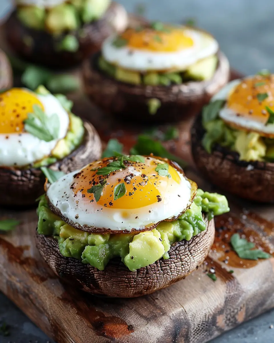 Discover this delightful and healthy vegetarian breakfast featuring avocado and egg stuffed mushrooms that are both indulgent and nutritious.