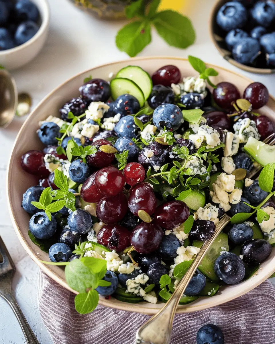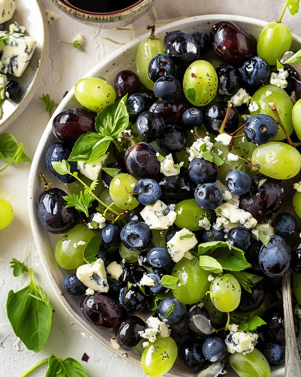 A refreshing salad that combines the sweetness of blueberries and grapes with the richness of blue cheese, offering a delightful flavor explosion in every bite.