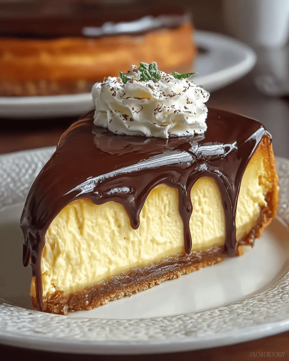 Indulge in the rich and creamy flavors of Boston Cream Cheesecake, a delightful twist on the classic dessert.