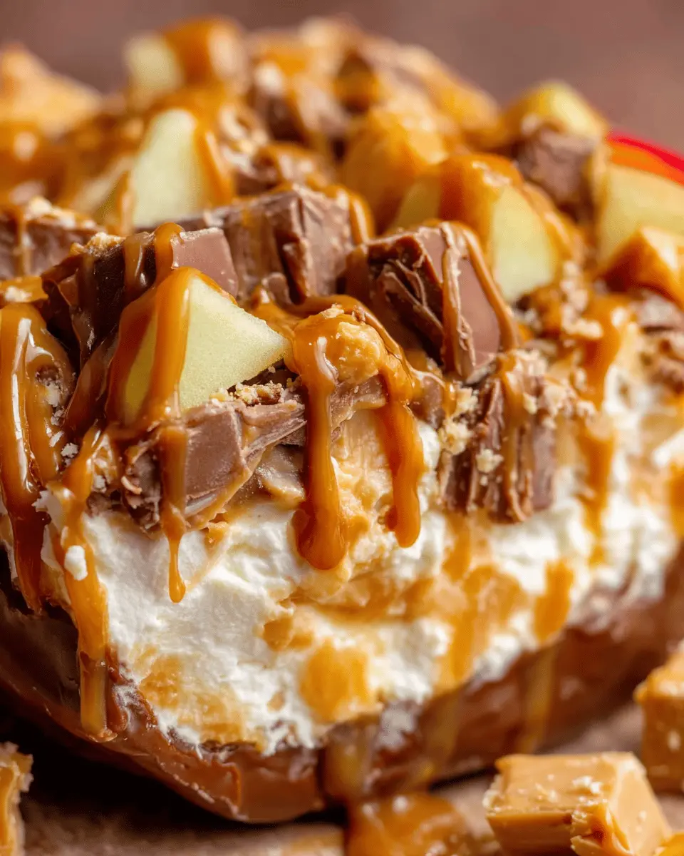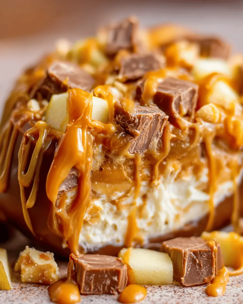 A deliciously indulgent dessert combining the flavors of caramel, apple, and Snickers for a perfect treat.