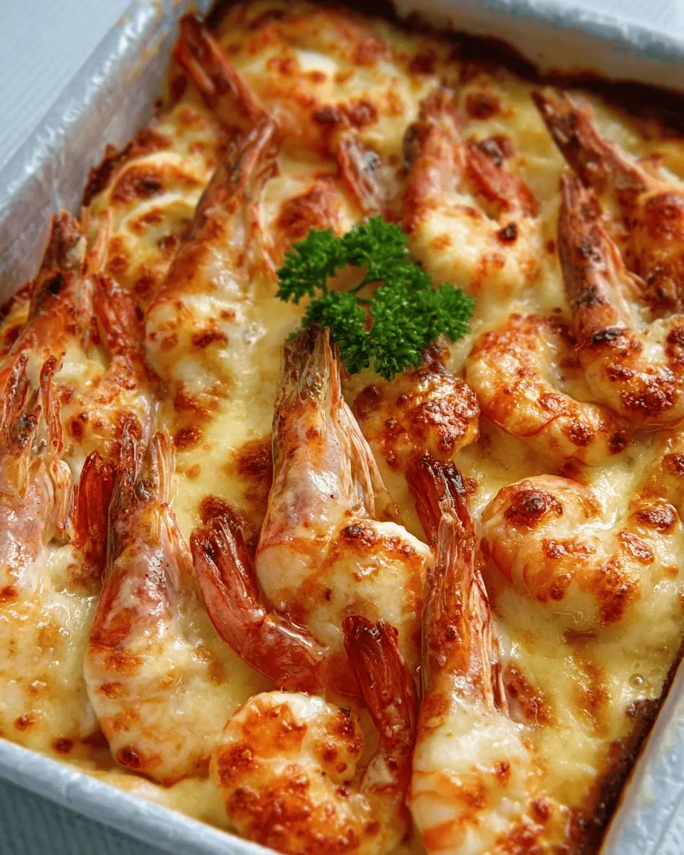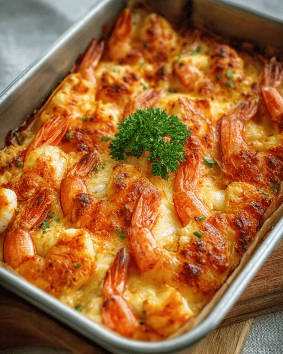 A delicious and indulgent cheesy shrimp bake that’s perfect for gatherings and family dinners.