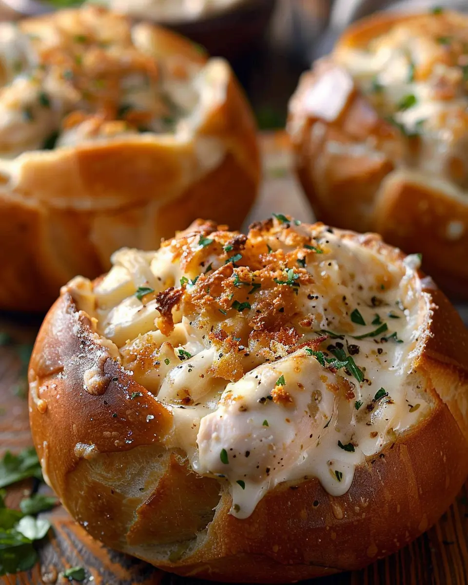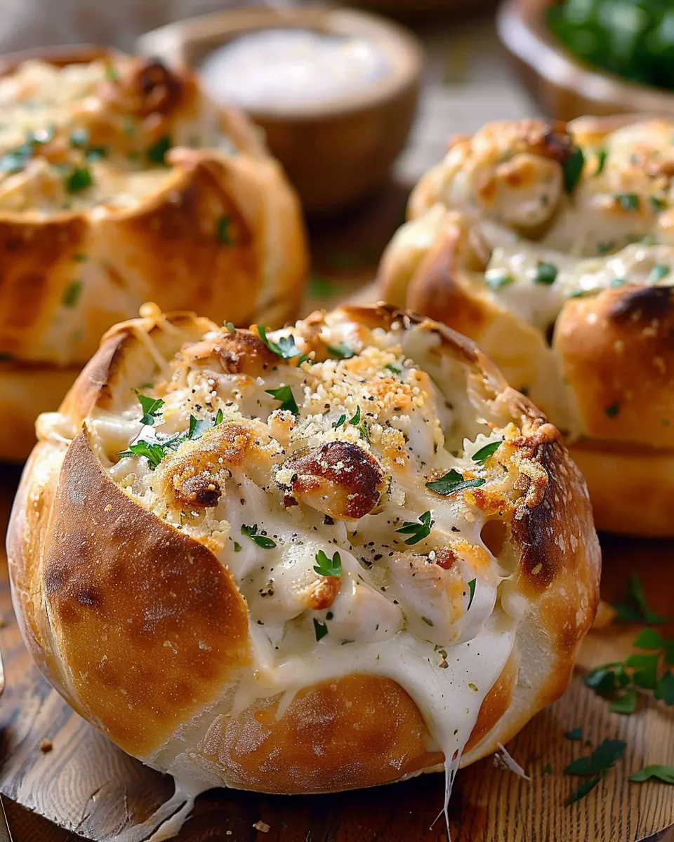 PrintChicken Alfredo Garlic Bread Bowls: Indulgent Comfort Food Delight