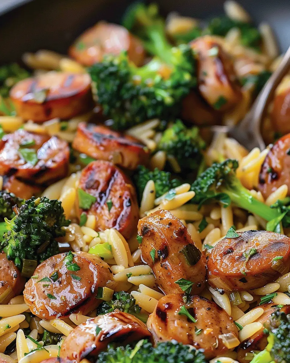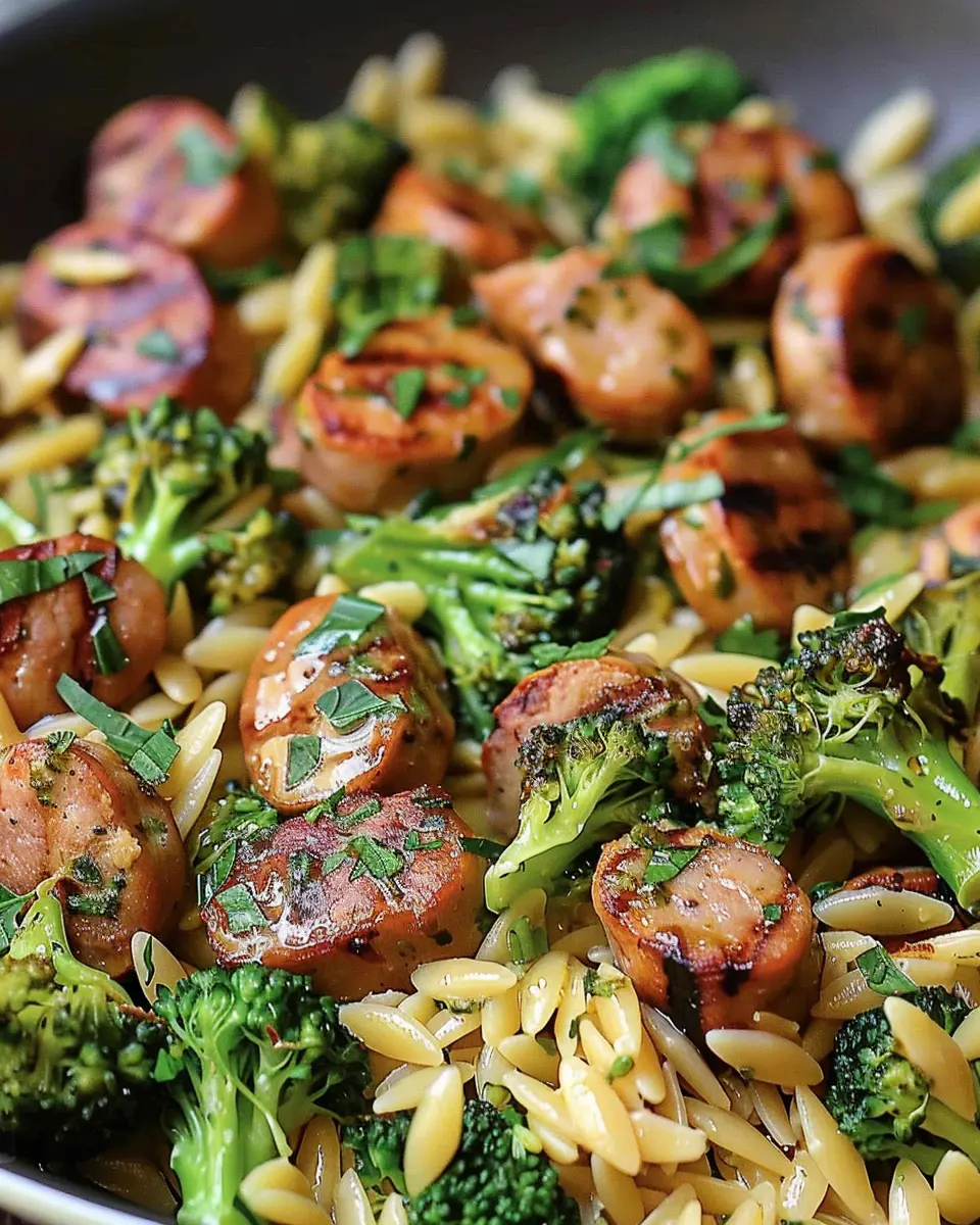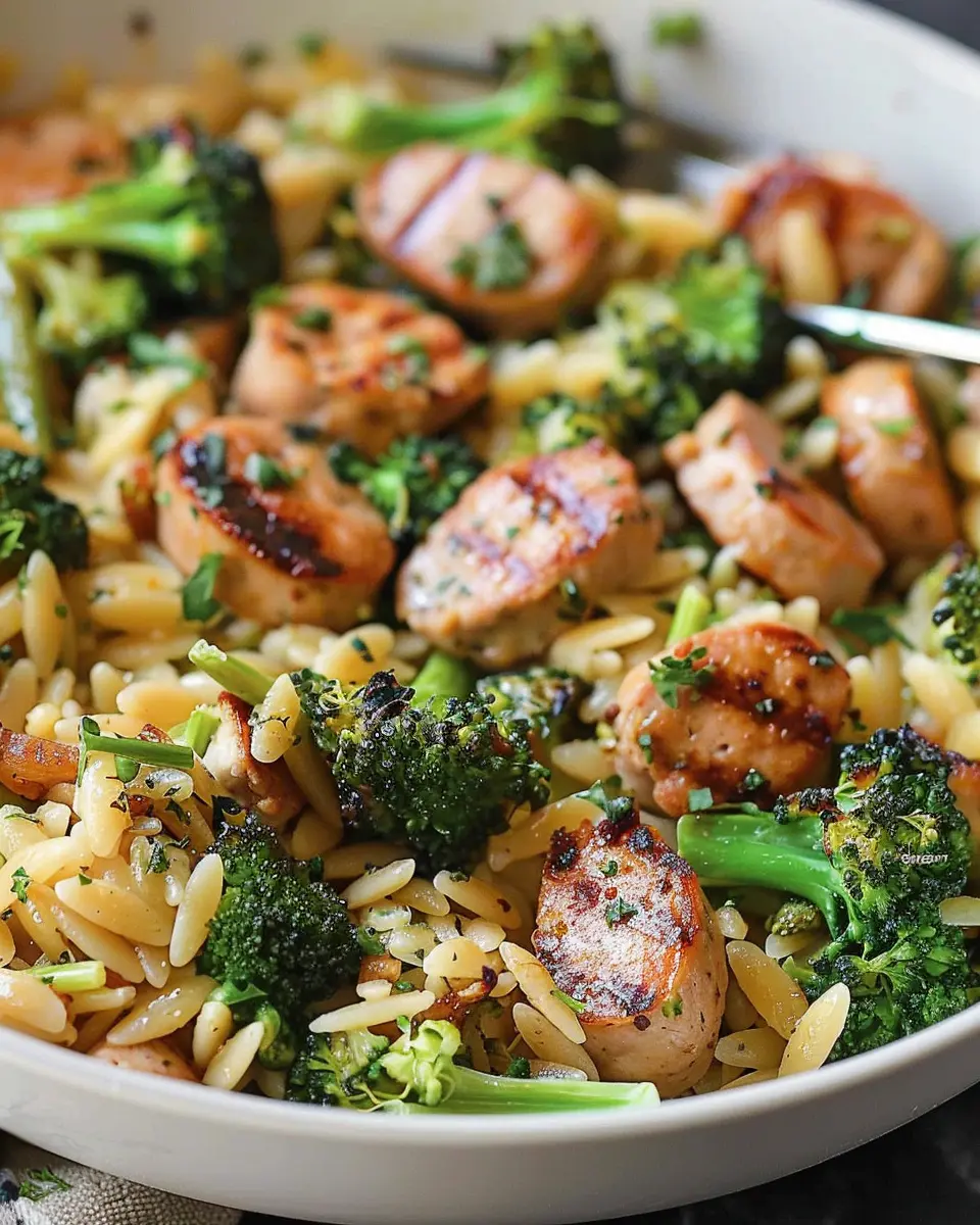 A delicious and comforting dish featuring chicken sausage, broccoli, and orzo.
