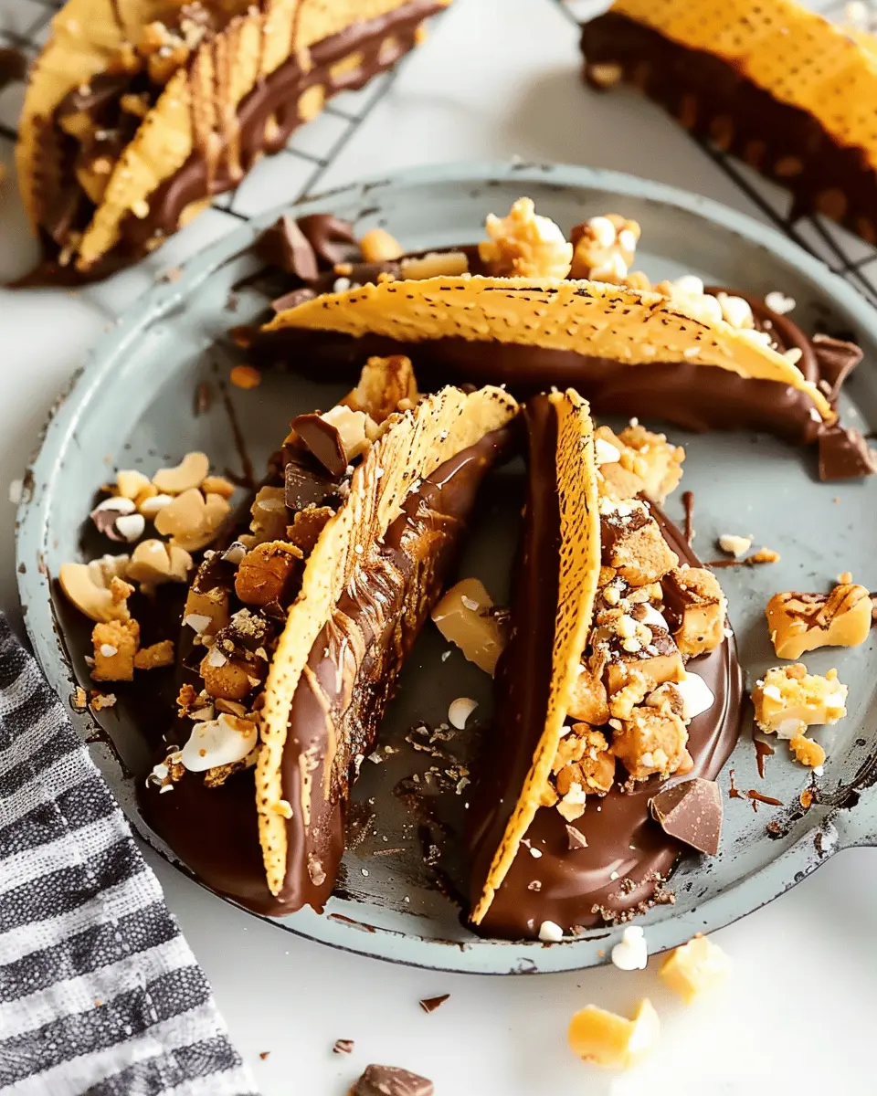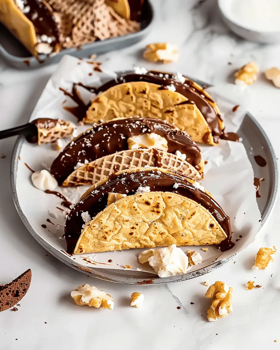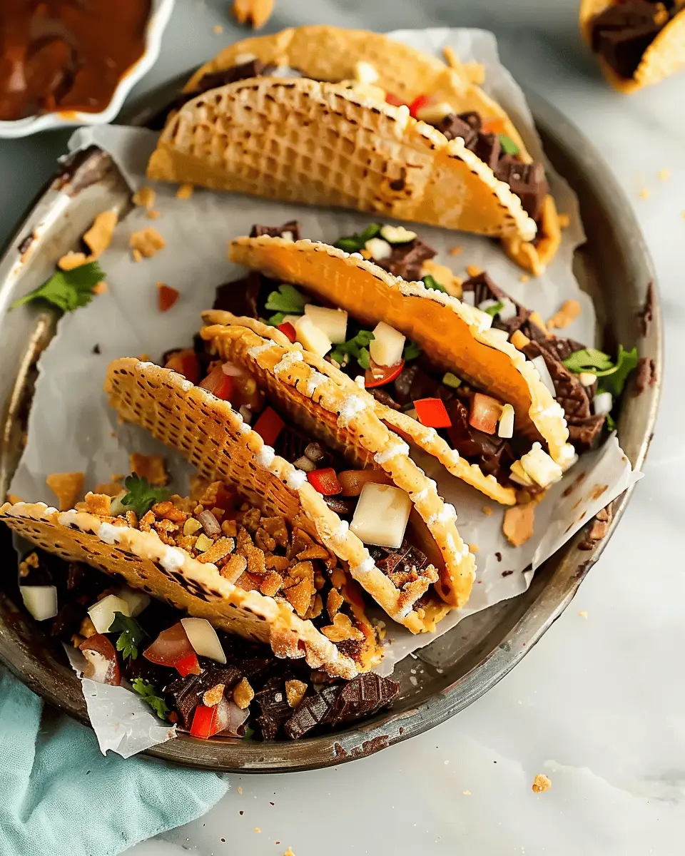 Make your copycat choco tacos pop by serving them on colorful plates or vibrant platters. You can even use waffle cones as mini taco stands! Drizzle some chocolate or caramel sauce over the top and sprinkle with crushed nuts or sprinkles for an eye-catching finish.