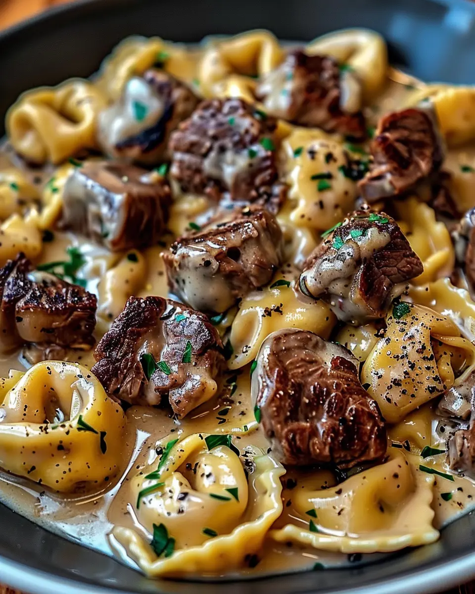 A deliciously indulgent dish that combines savory steak and tortellini in a creamy garlic sauce.