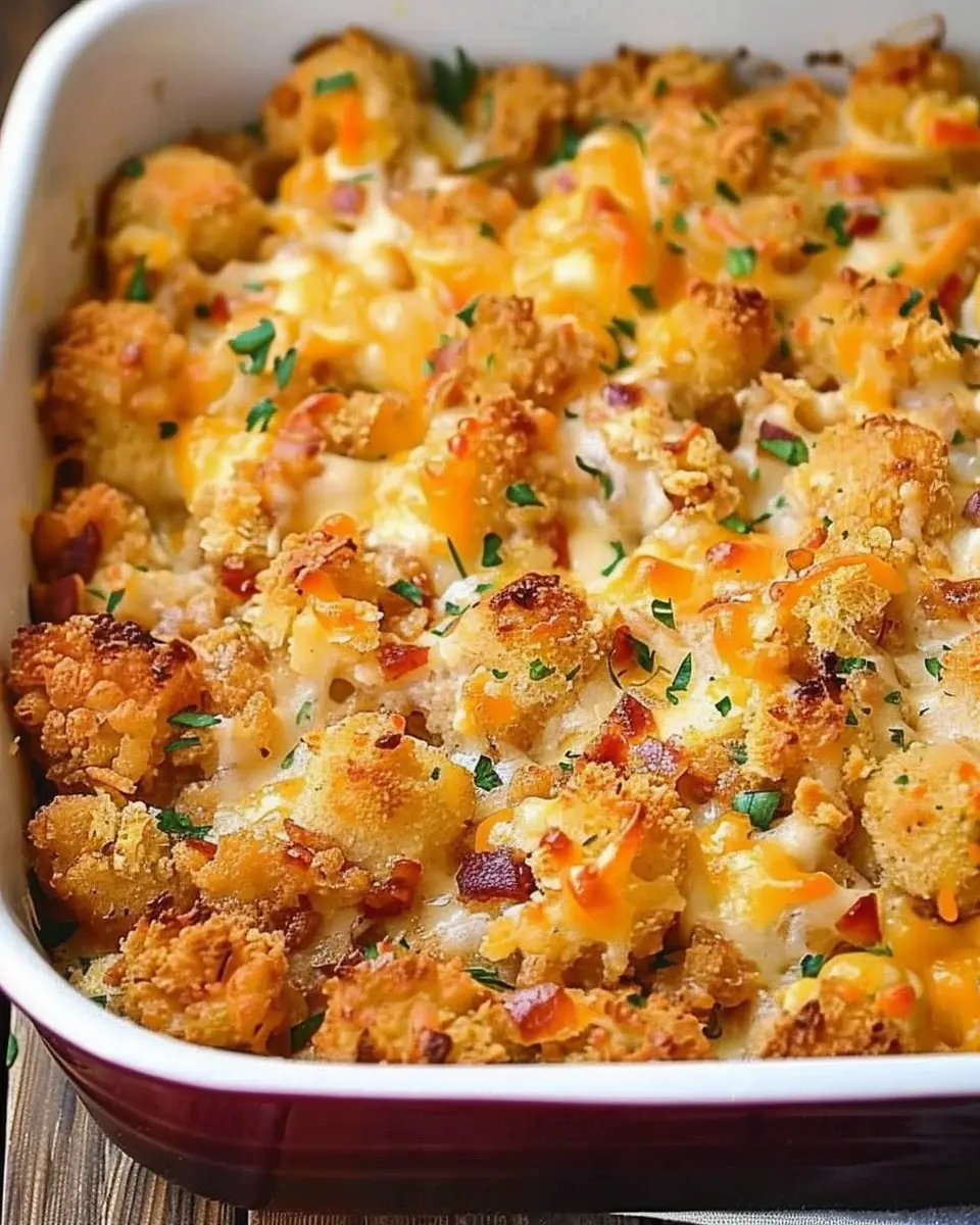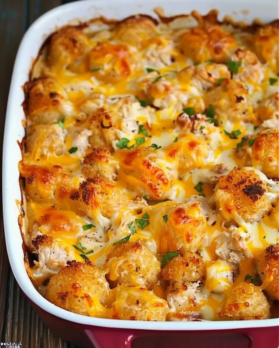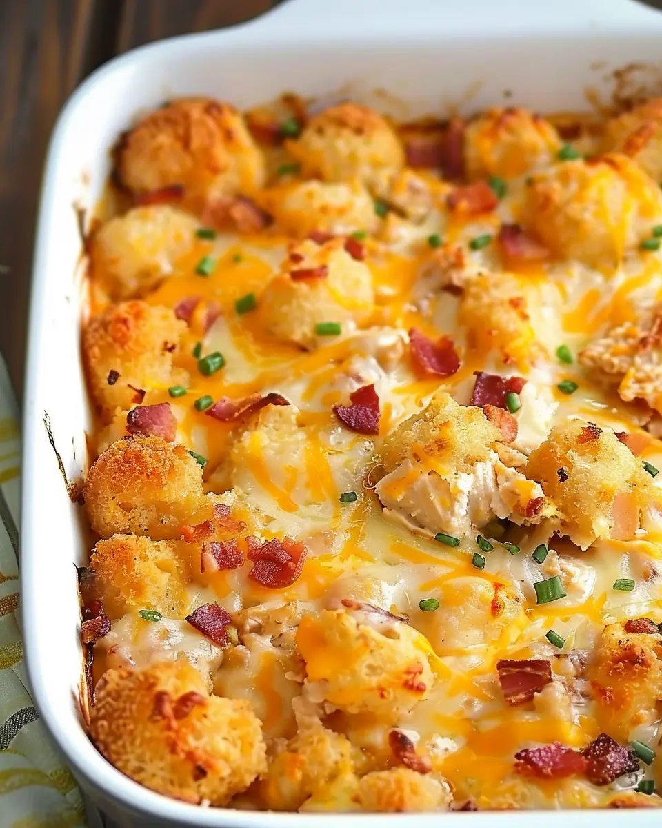 A delicious and easy-to-make casserole that combines chicken, bacon, and tater tots for a comforting meal.