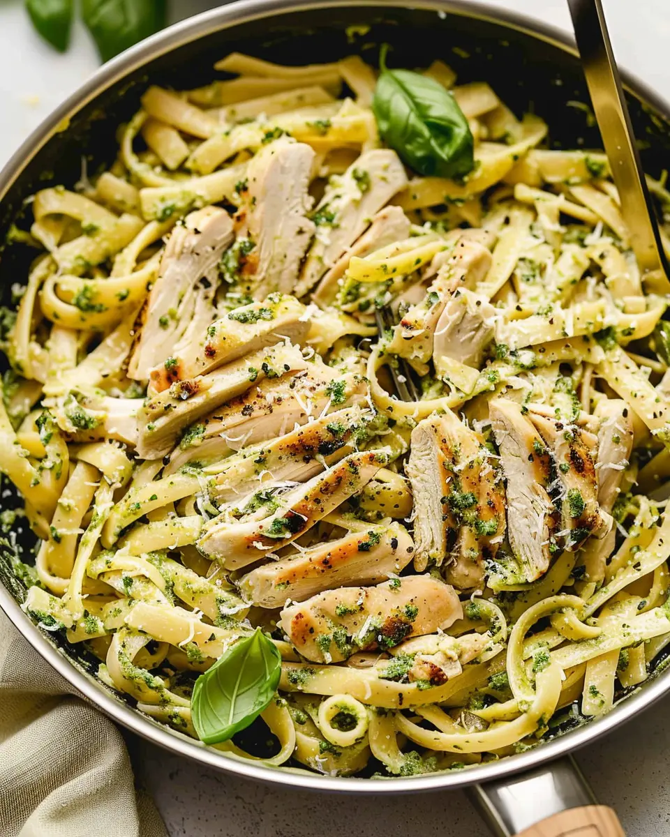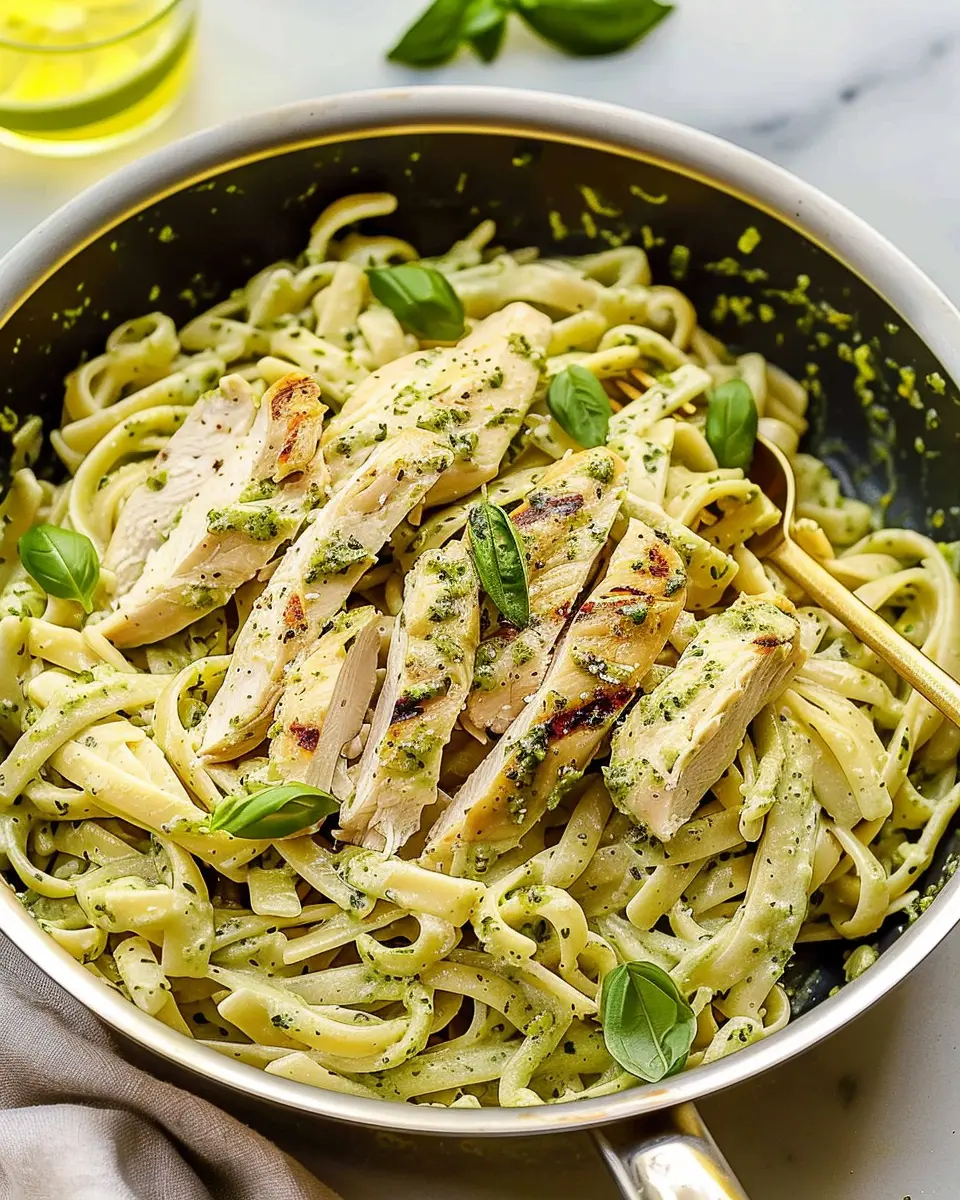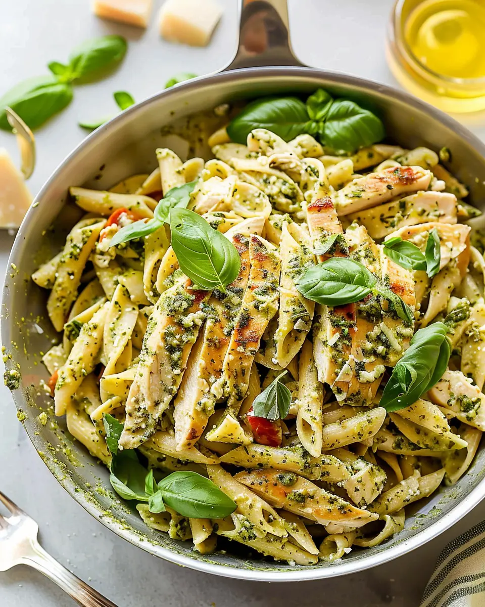 Final Touch: Garnish with fresh basil and an extra sprinkle of Parmesan. Serve immediately to enjoy your creamy chicken pesto pasta while it’s warm and inviting.