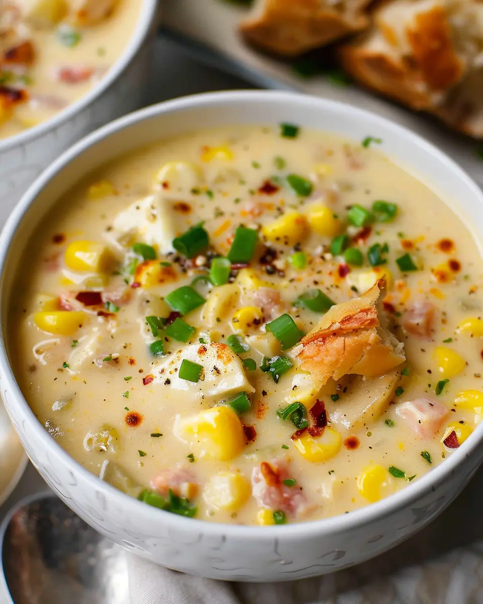A delicious creamy corn chowder featuring turkey bacon for a comforting meal.