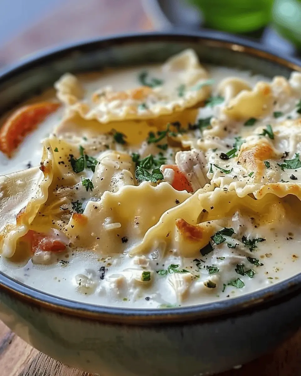 A warm and cozy soup that combines the flavors of lasagna and creamy chicken broth, perfect for chilly days.
