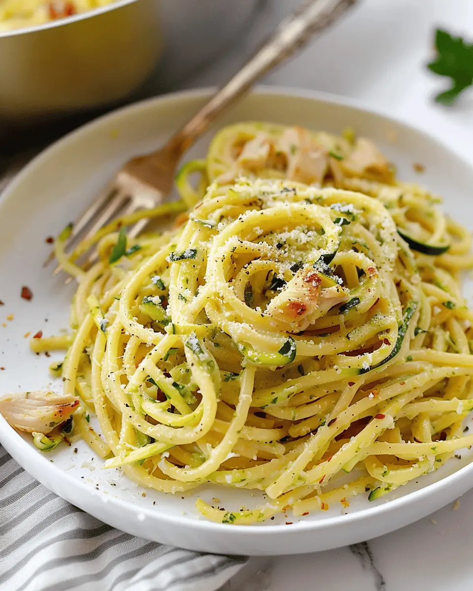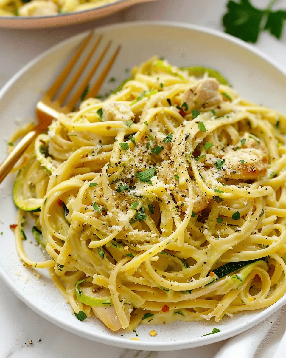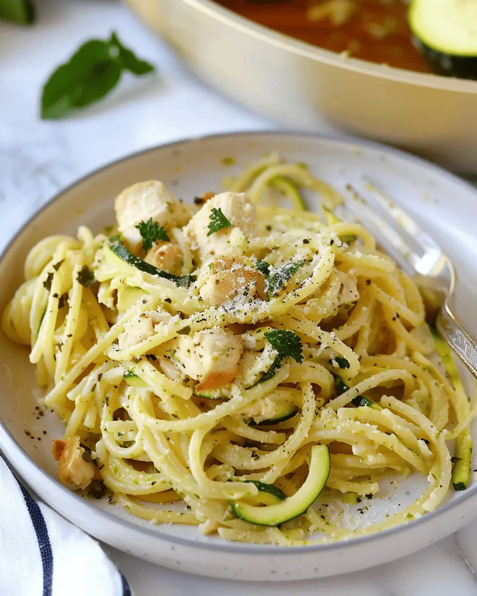 Presentation matters! Finishing your creamy zucchini and chicken pasta with fresh basil or parsley adds a burst of color and freshness. Grated Parmesan cheese will not only elevate the flavor but also give your dish a touch of elegance. A sprinkle of chili flakes can add a hint of heat, appealing to guests who enjoy a little spice. If you want to impress, arrange the pasta in a nest shape and place a few sautéed zucchini ribbons on top for an eye-catching display.