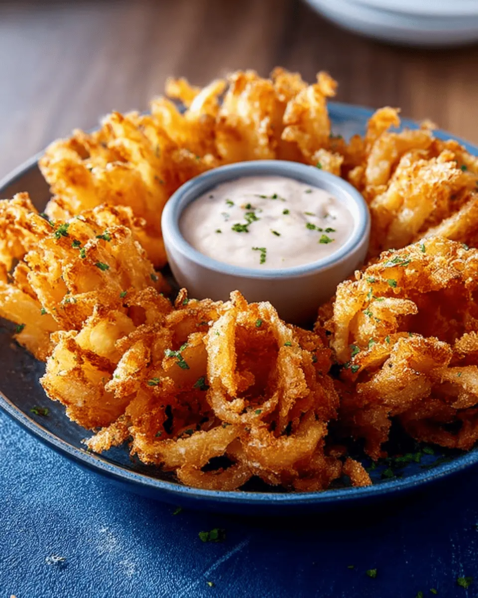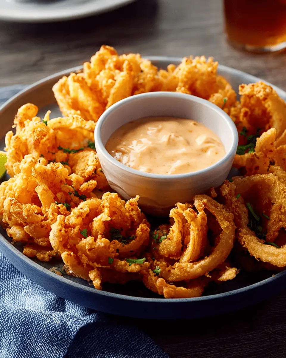 Crispy Blooming Onion Bites served with a zesty dipping sauce are the perfect appetizer for any occasion. Enjoy the crunchy texture and bold flavors!