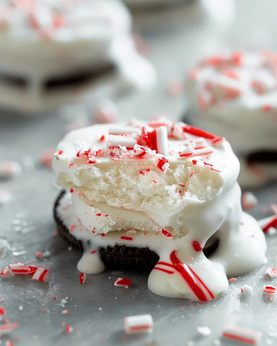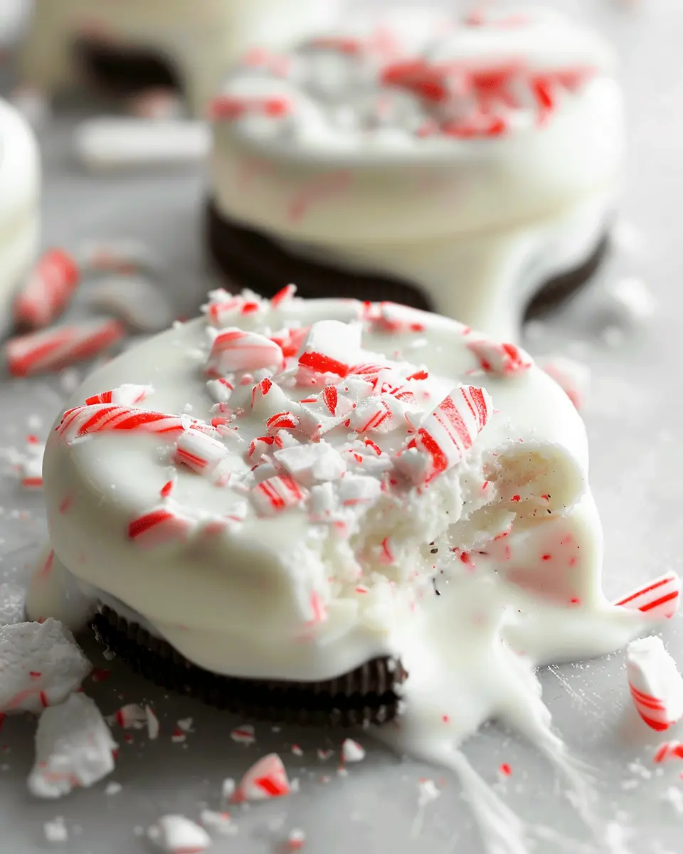 Delicious and festive peppermint-infused white chocolate covered Oreos, perfect for holiday gatherings.