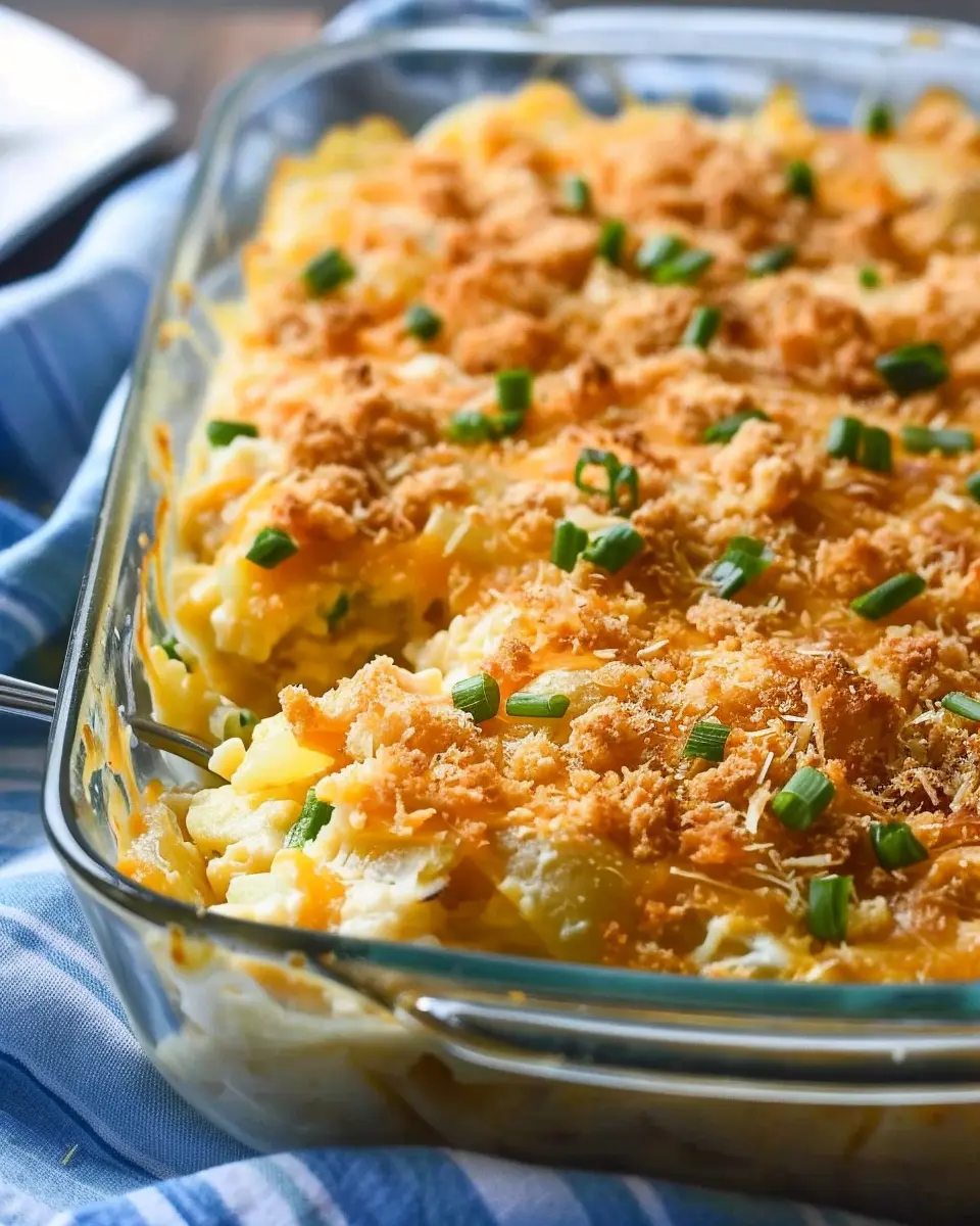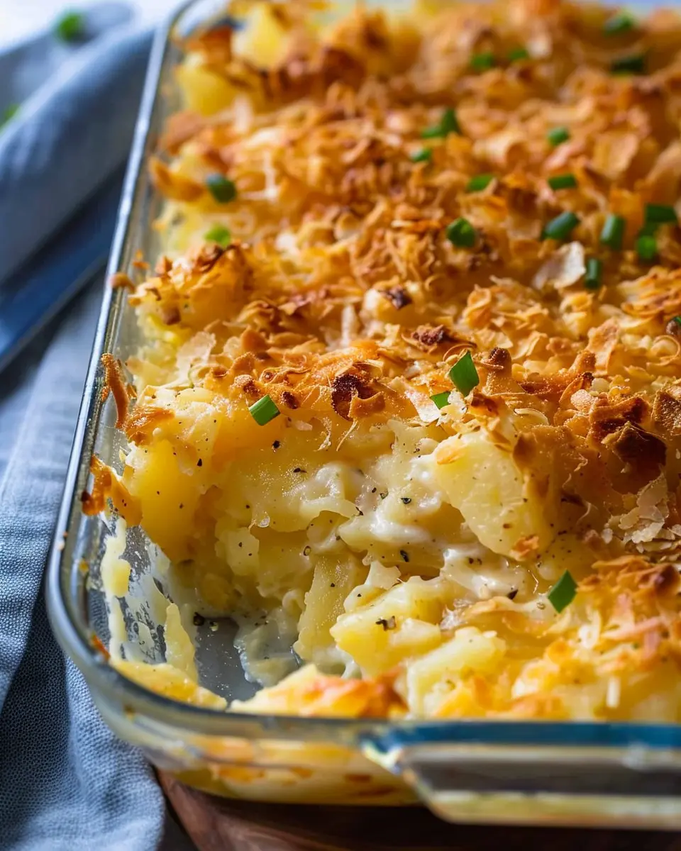 Indulge in this delicious twist on the classic Funeral Potatoes with the added flavors of turkey bacon and chicken ham, perfect for gatherings and comforting meals.
