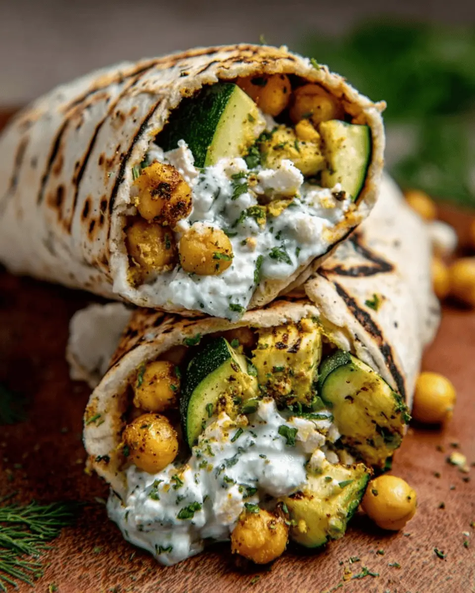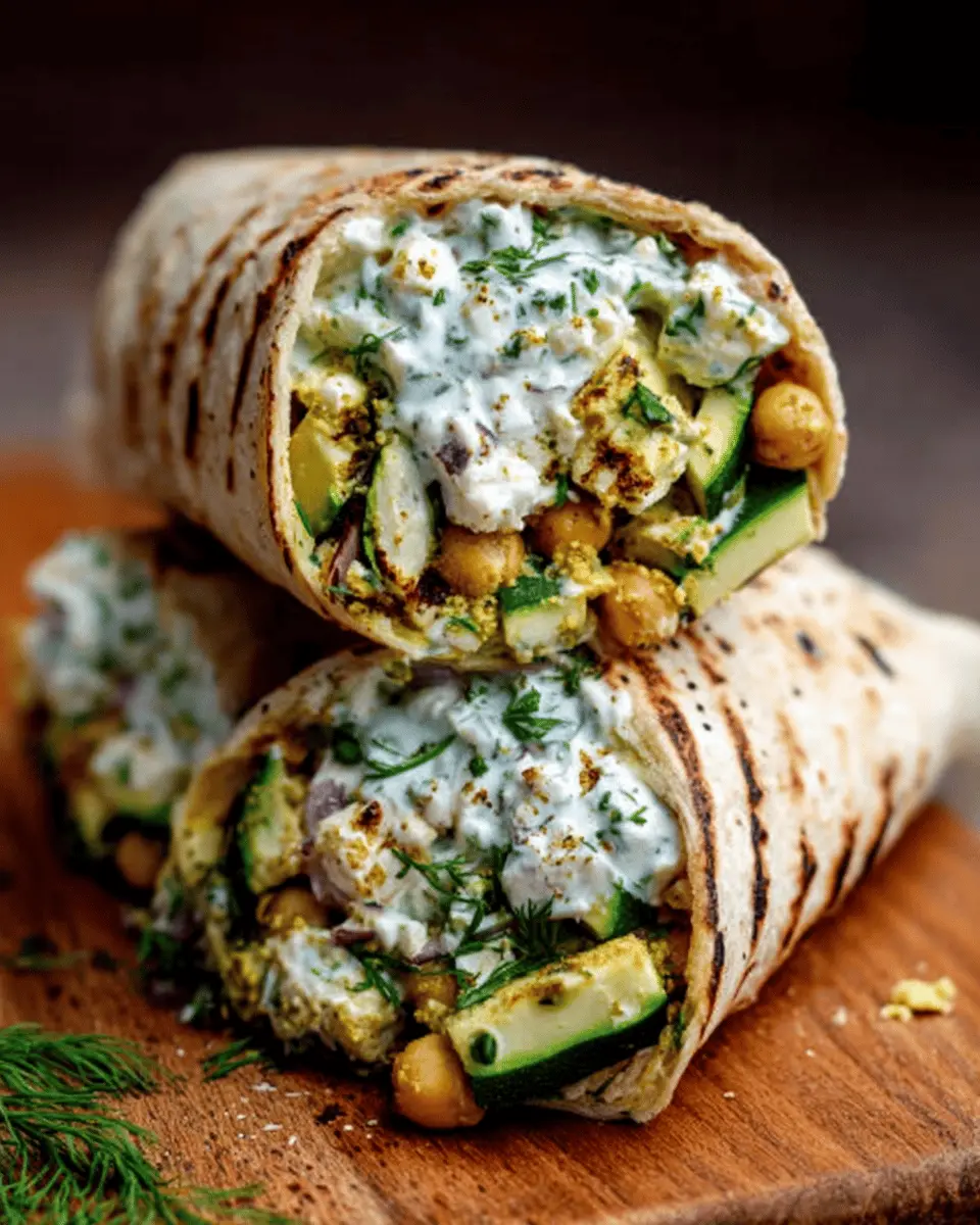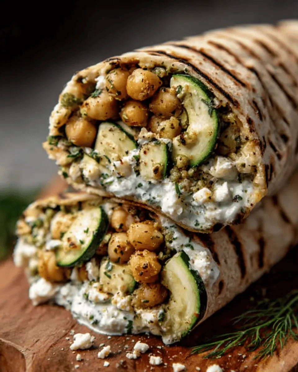 - Assembly: Start by spreading a generous layer of the herbed yogurt on your wrap. Layer on the grilled zucchini, spoon the chickpeas on top, and finish with some crumbled feta. Roll it up tightly, tucking in the ends as you go.