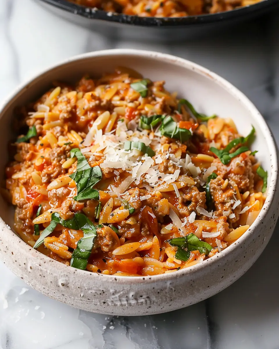• Plating: Serve your Ground Beef Orzo warm, garnished with extra cheese or fresh herbs if desired.