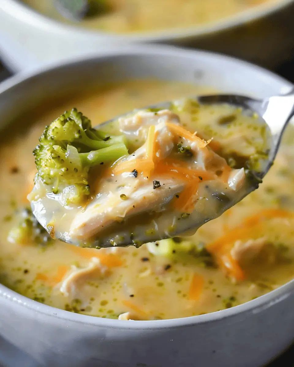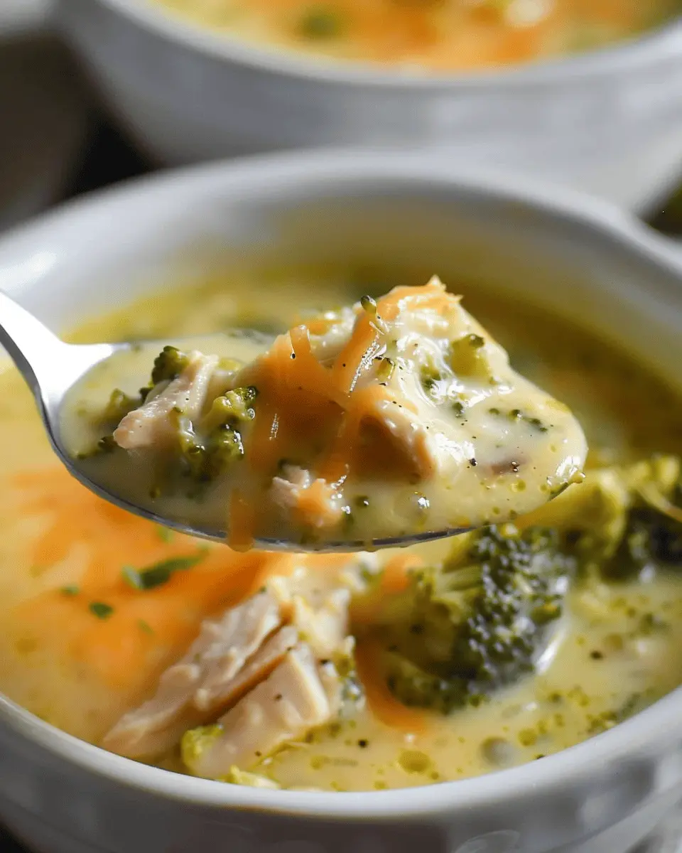 This creamy and cheesy soup combines broccoli and chicken, making it a perfect comfort food recipe.