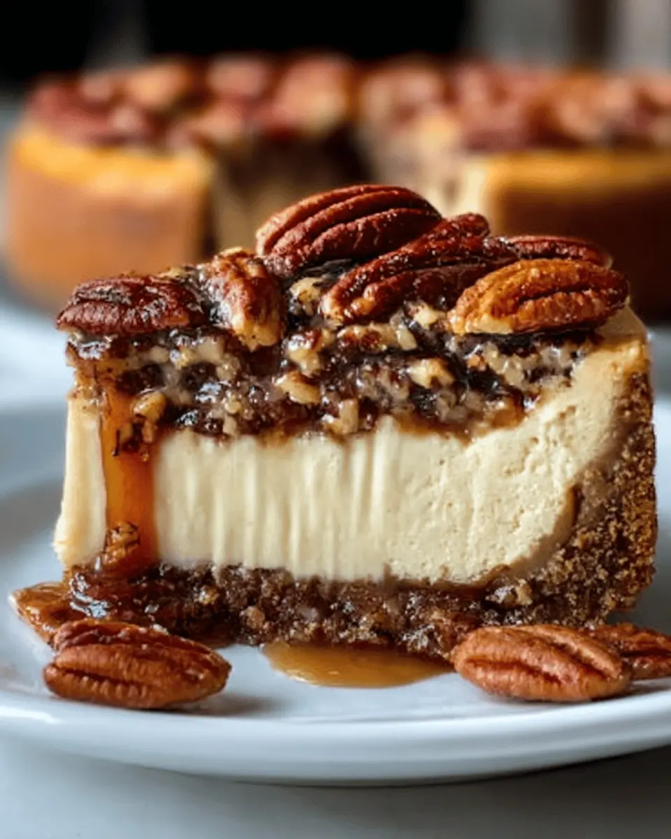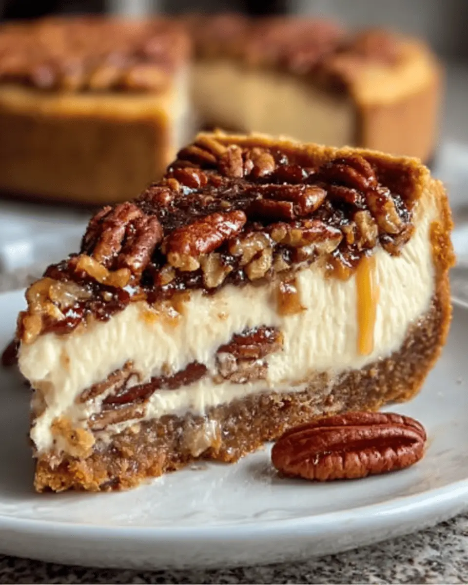 Layered Delight: For a modern twist, crumble a few pieces of the cheesecake into a dessert glass and layer with whipped cream, chopped pecans, and chocolate shavings for a decadent parfait.