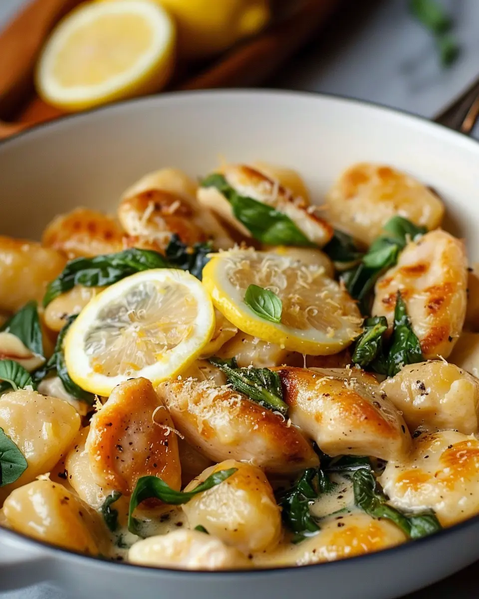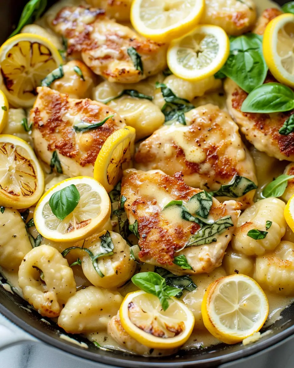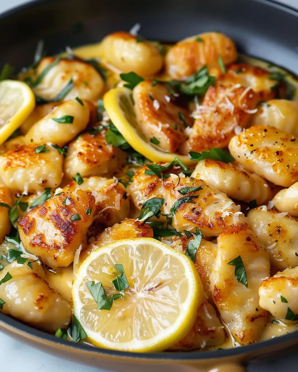 A delightful and comforting dish combining tender chicken and gnocchi in a zesty lemon sauce.