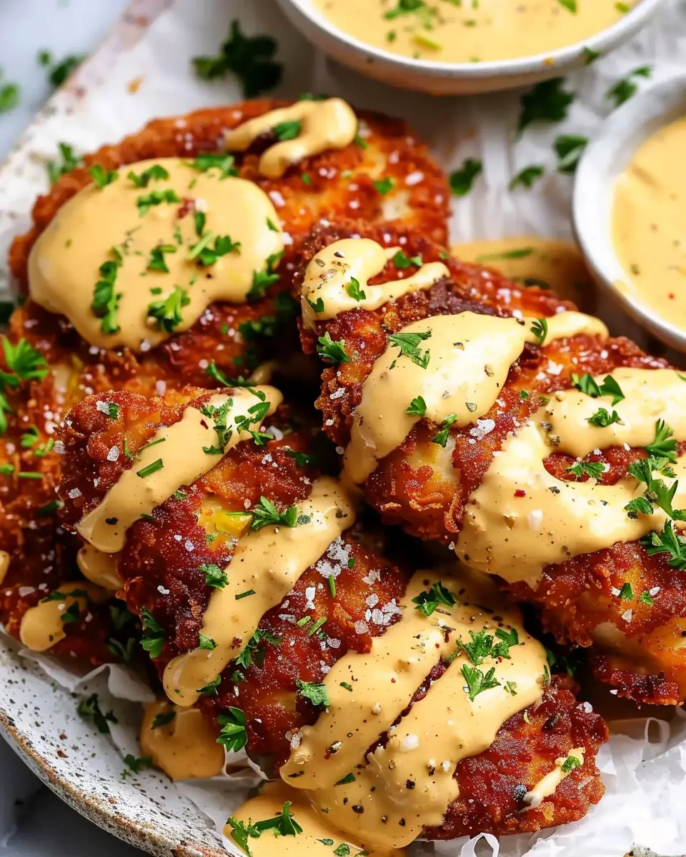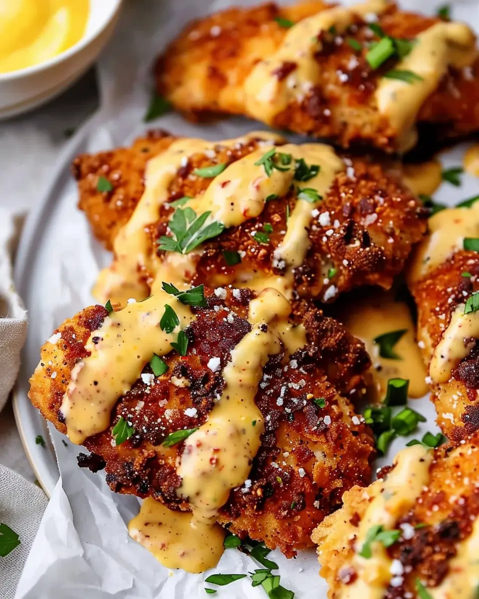 Now that everything is ready, it’s assembly time! Place the fried pretzel chicken on your serving plate, and generously drizzle the creamy cheddar-mustard sauce over the top.