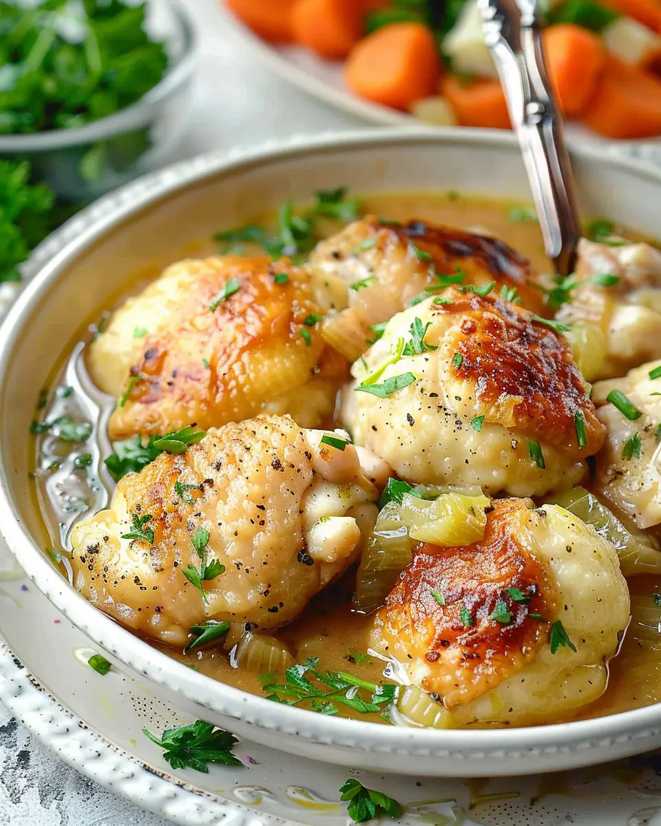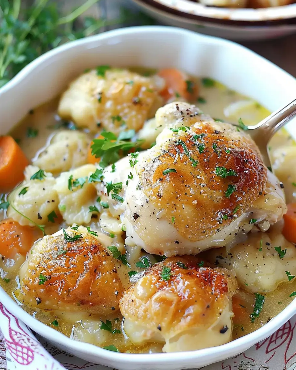 • As you dig in, relish the mixture of tender chicken, flavorful broth, and fluffy dumplings.