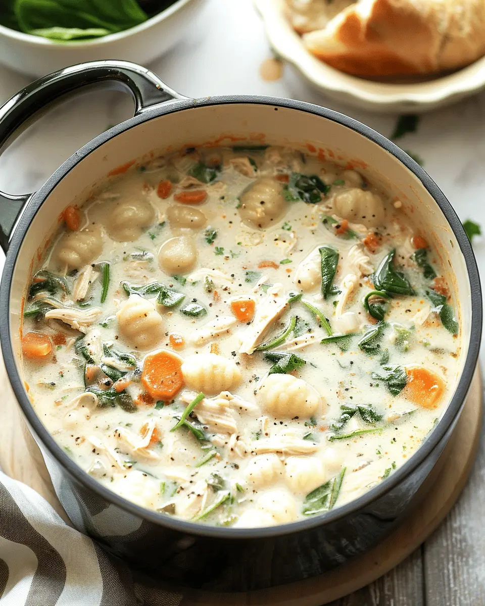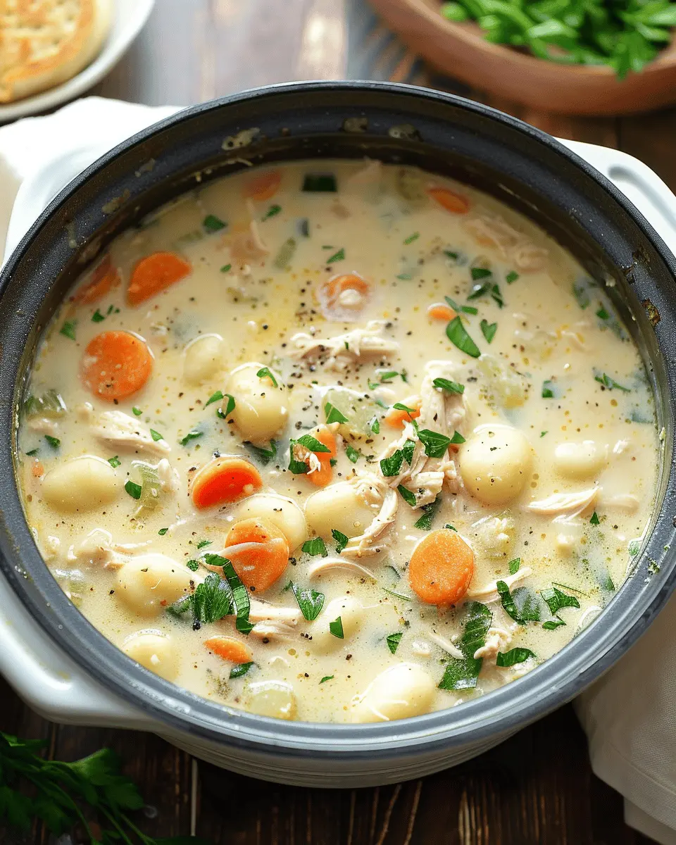 A comforting and creamy soup made with tender chicken and soft gnocchi, perfect for cozy nights.