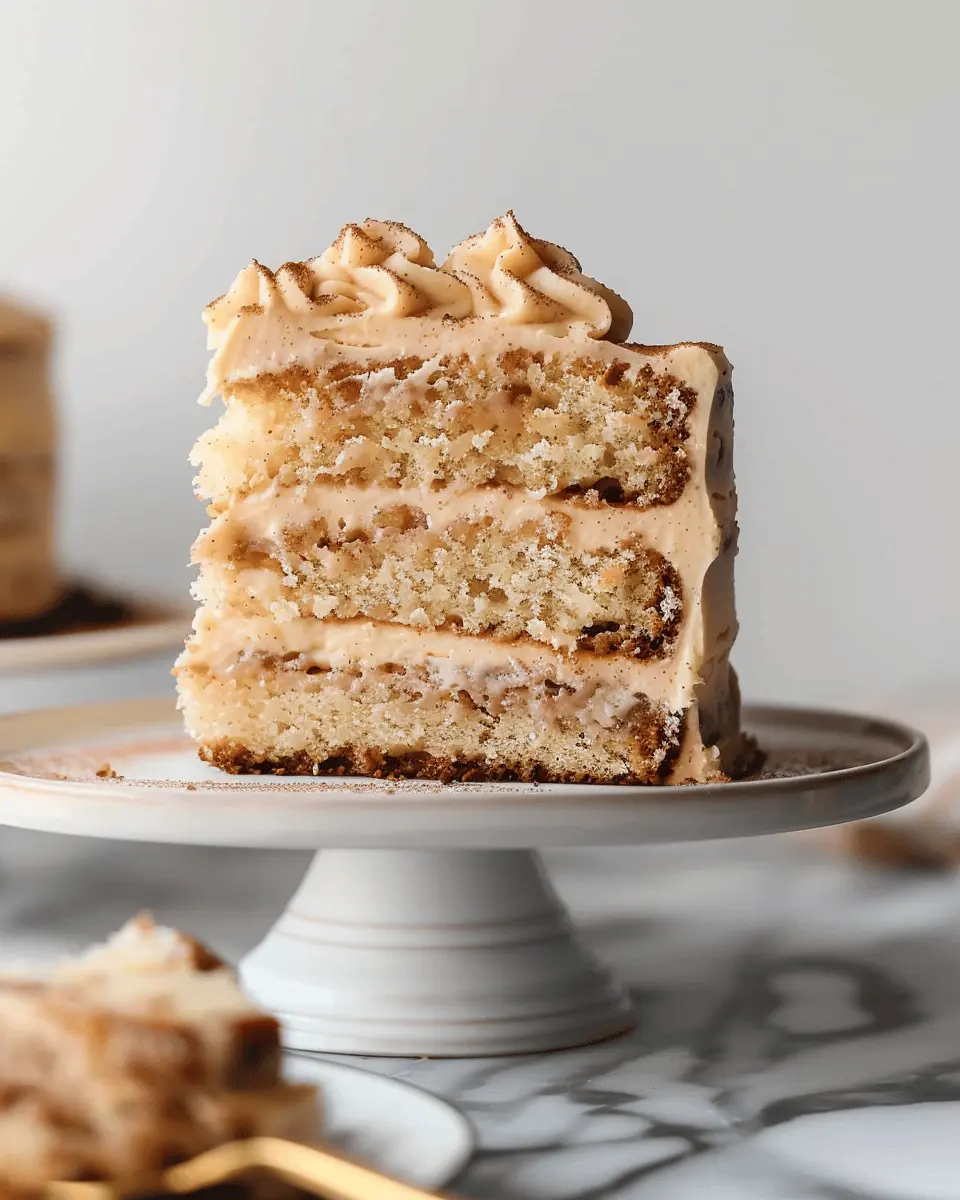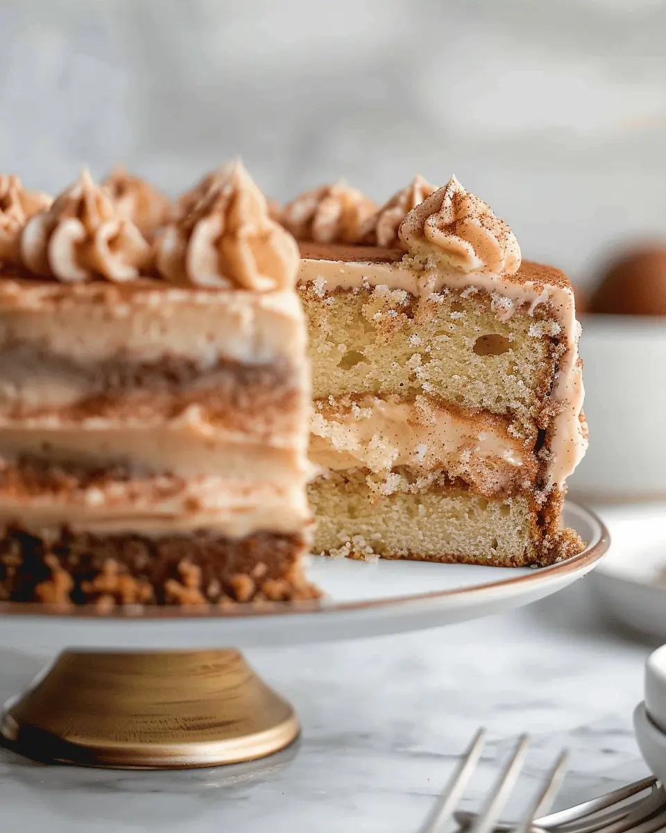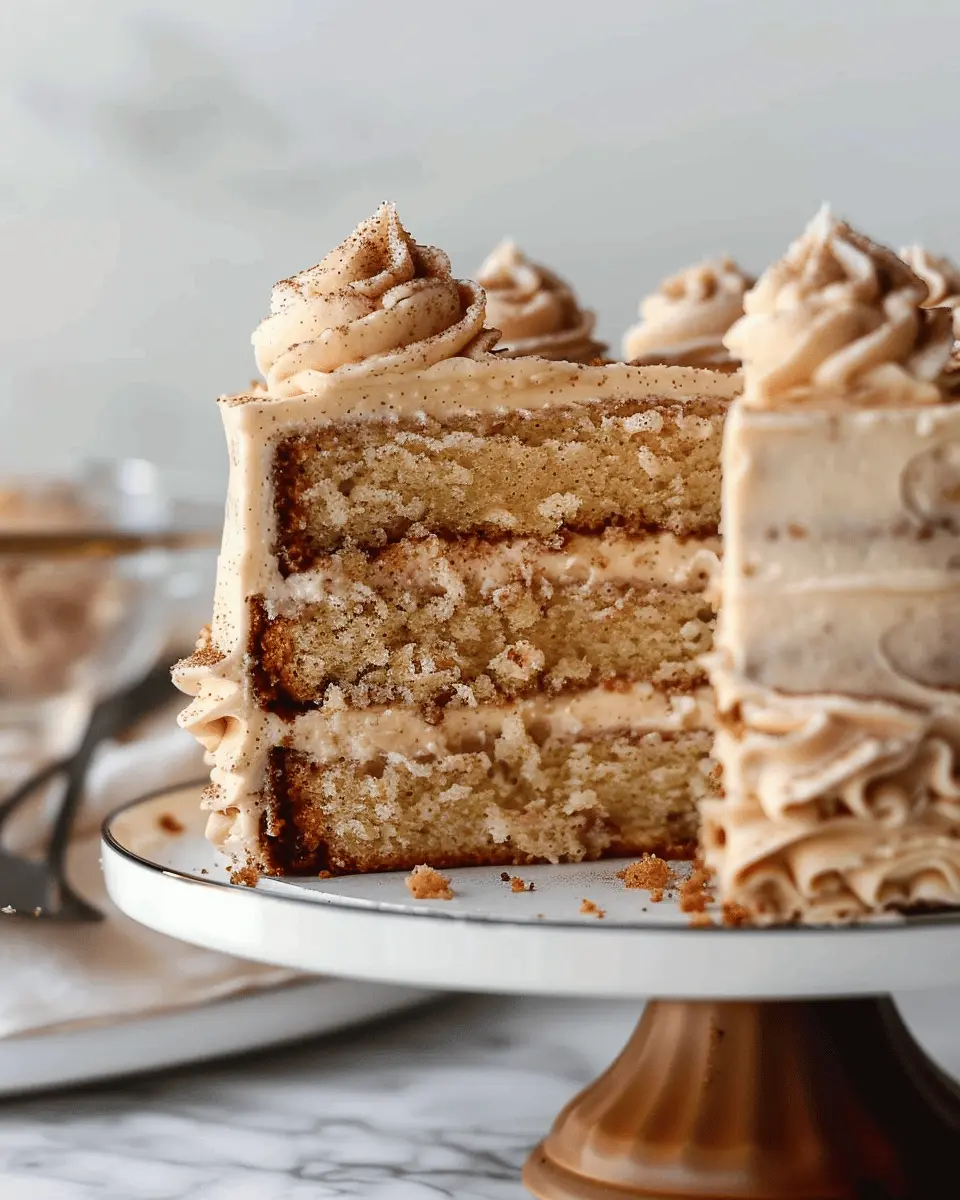 Once your cakes are completely cool, place one layer on a serving plate. Evenly spread a layer of frosting on top, then place the second cake layer on top and frost the entire cake. For a little extra flair, consider decorating it with some additional cinnamon sugar or even a sprinkle of chopped nuts!
