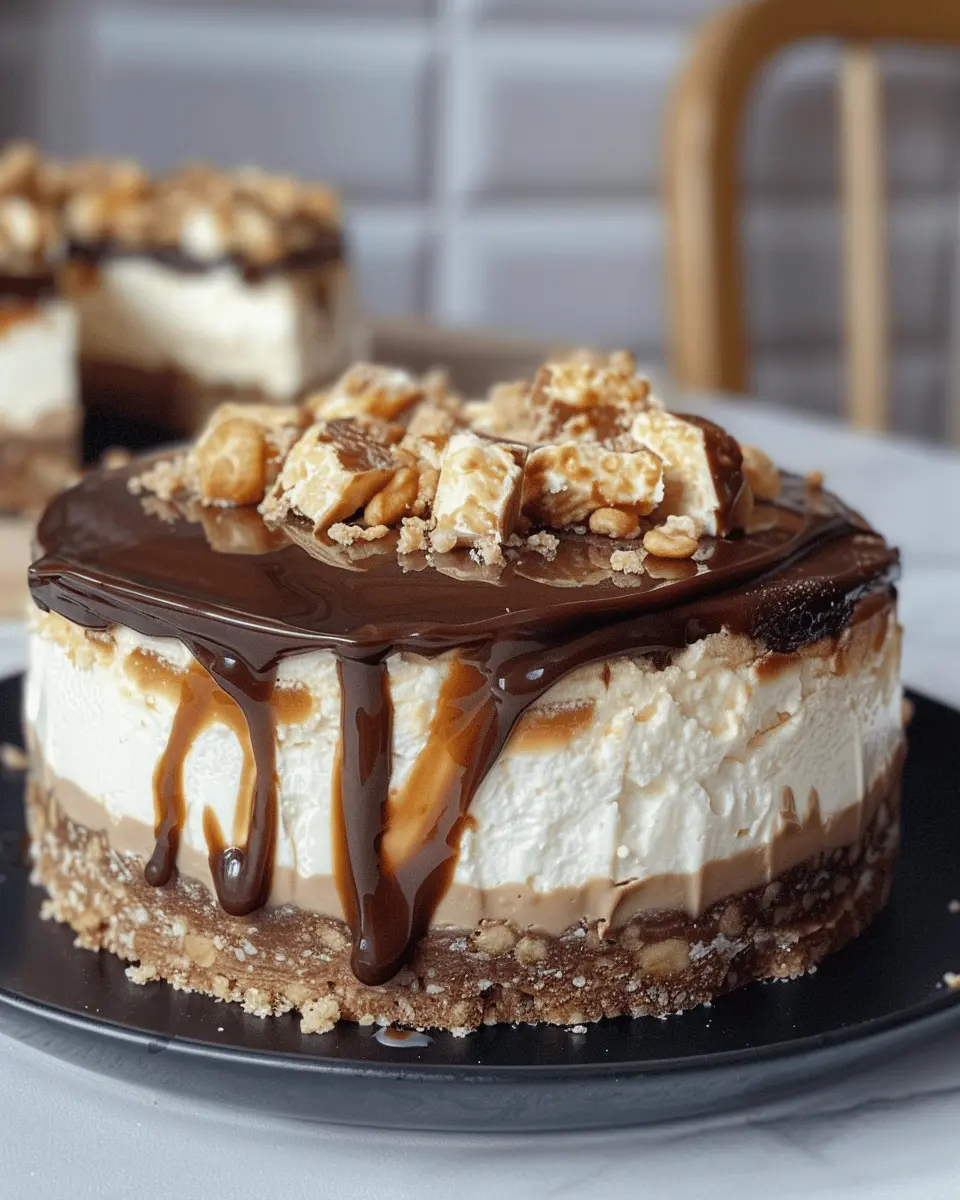 A luscious chocolate ganache will add the finishing touch, making your Snickers Cheesecake irresistible.
