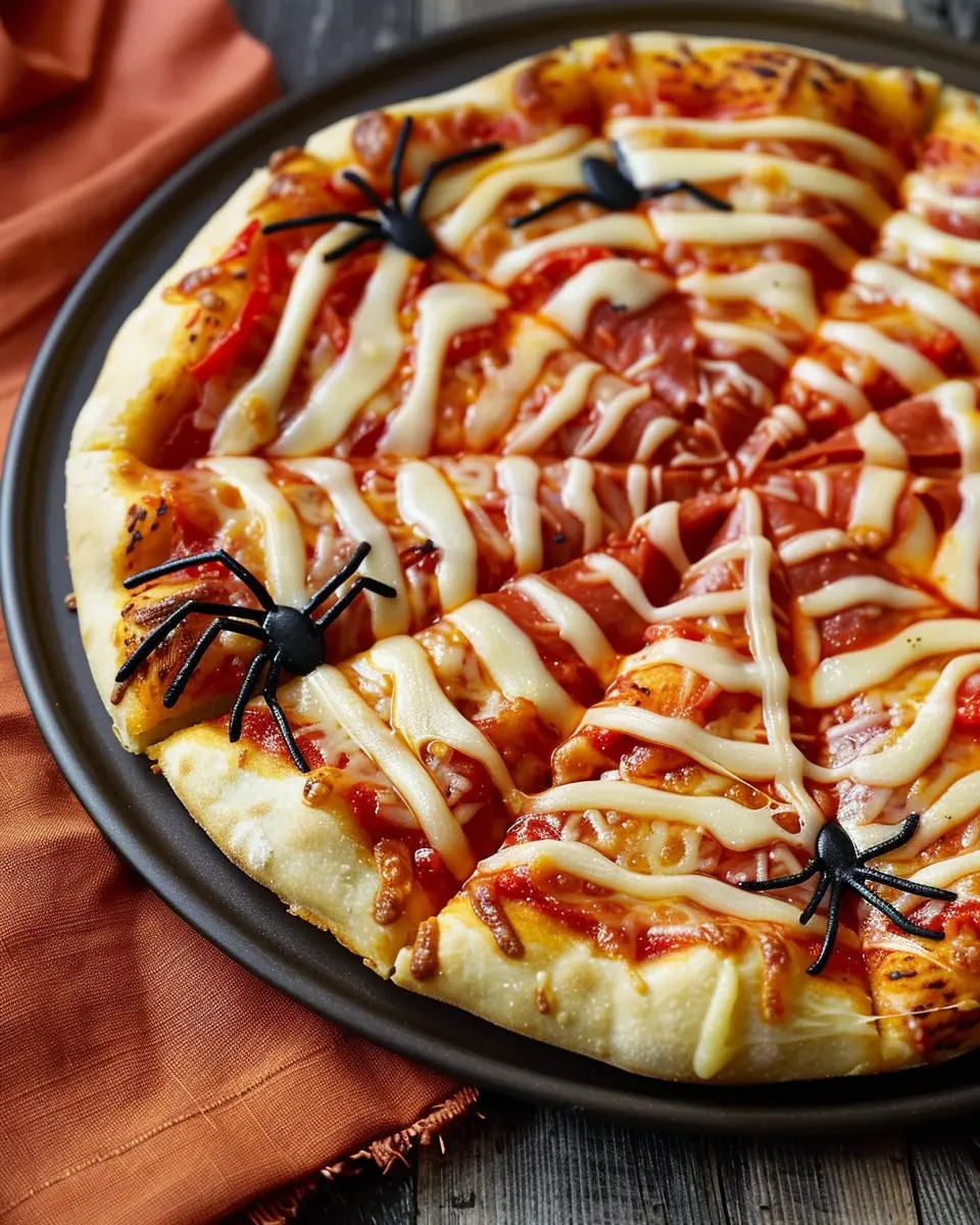Delight in the fun and creativity of Spiderweb Pizzas, featuring savory turkey bacon and chicken ham for a delicious twist.