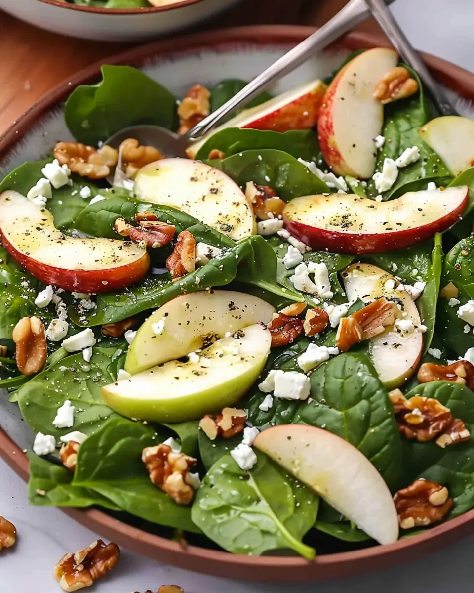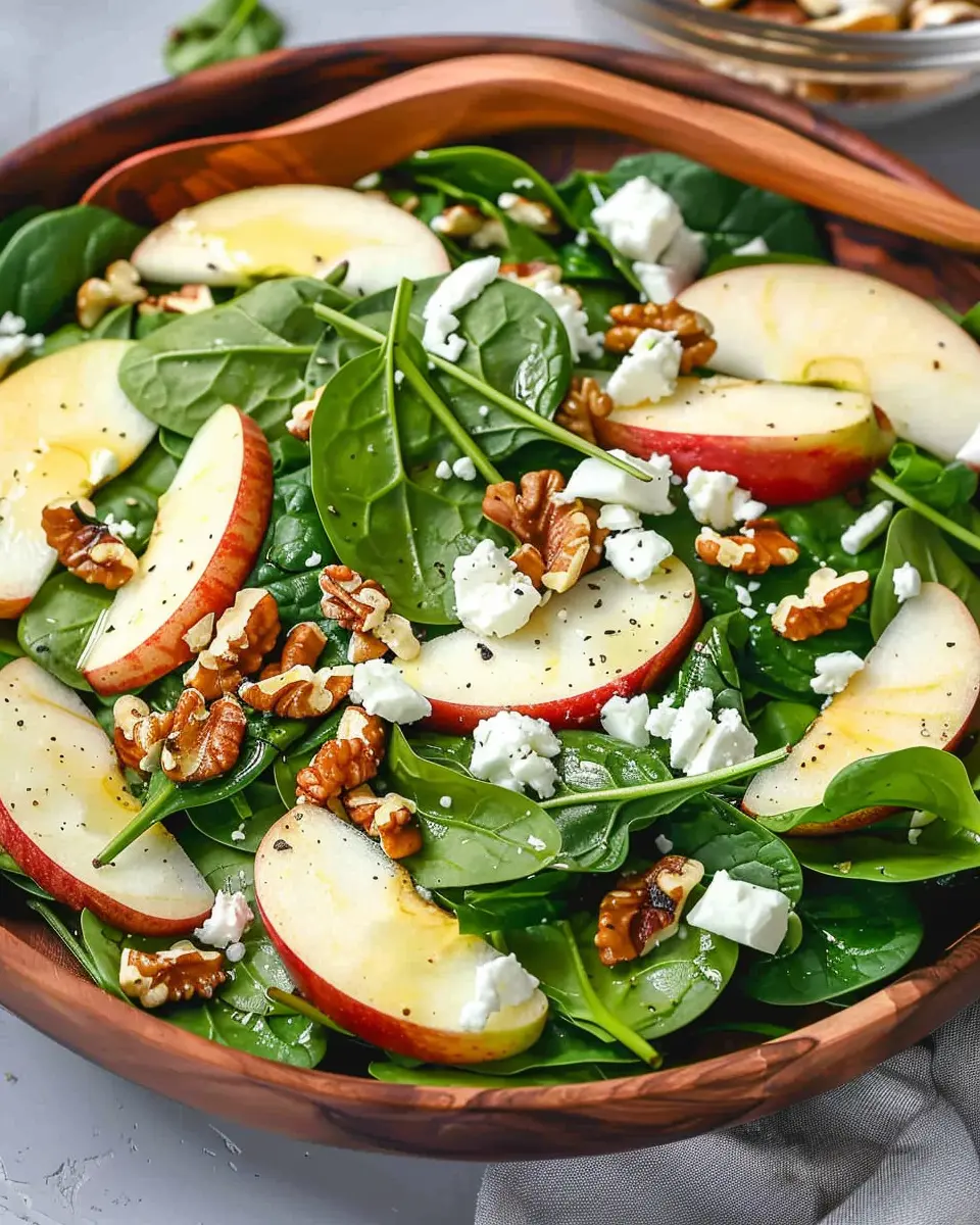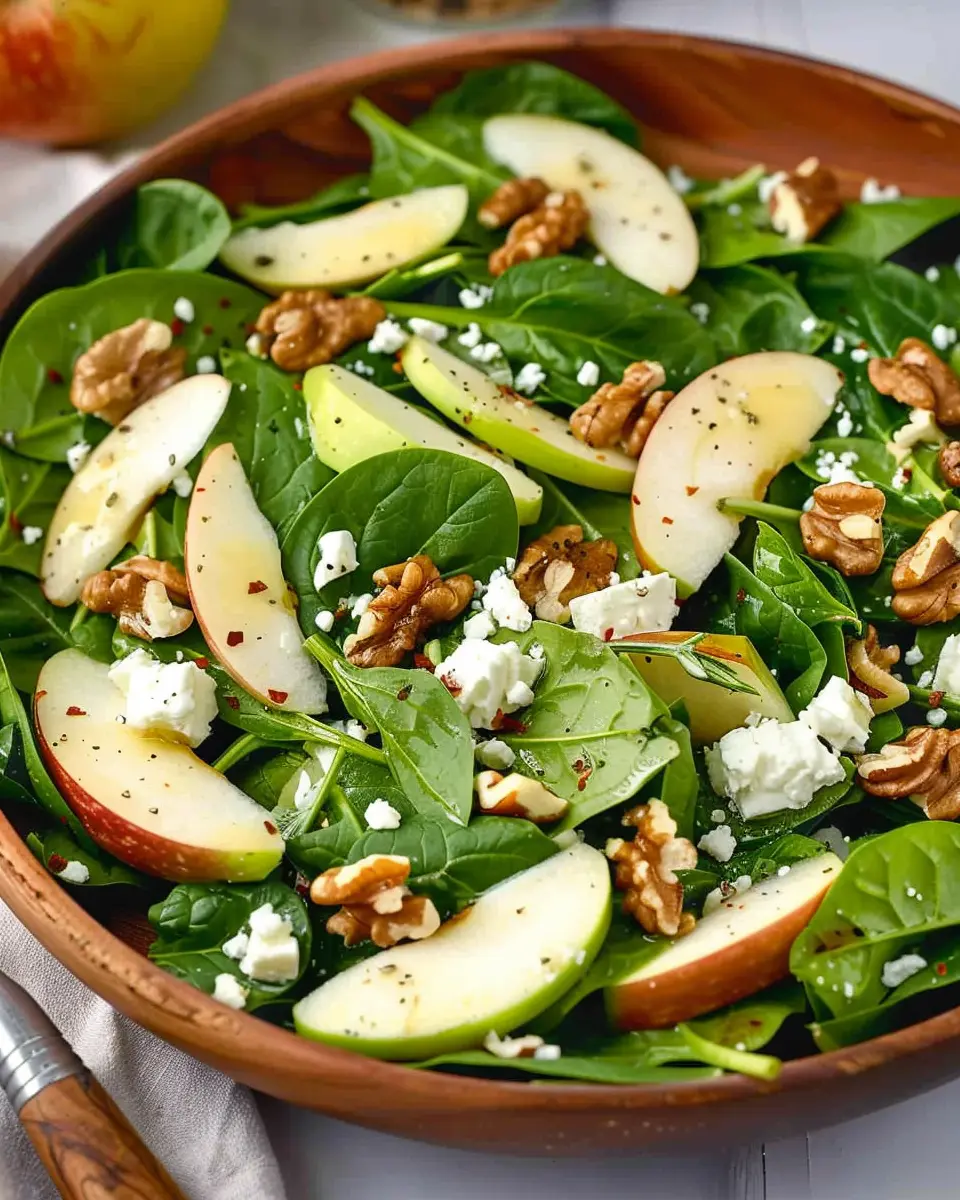 A delicious and nutritious spinach salad featuring crisp apples, toasted walnuts, and creamy feta cheese.