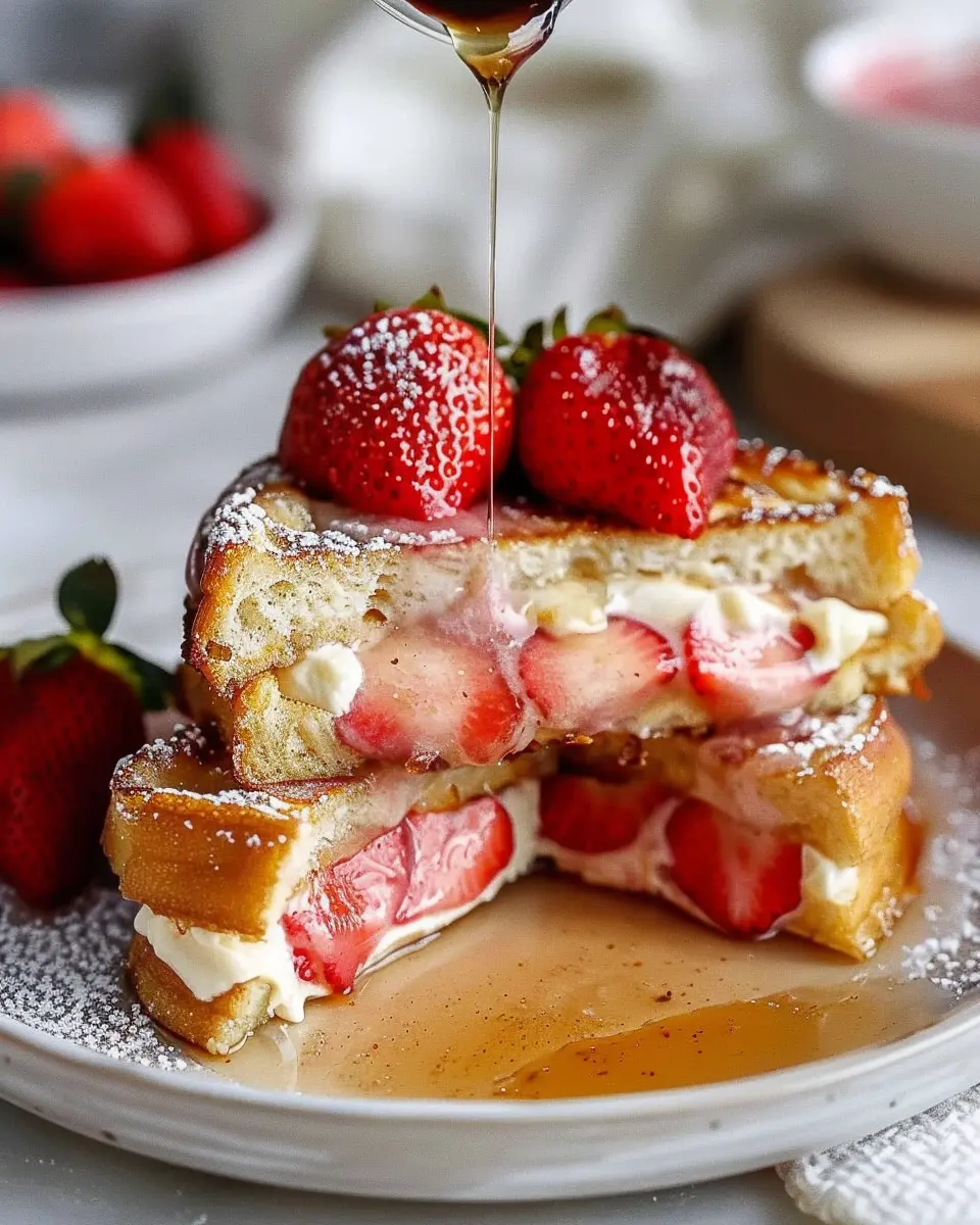When serving your strawberry cream cheese stuffed french toast, the options for toppings are endless! Start with a drizzle of real maple syrup for that nostalgic touch of sweetness. Freshly sliced strawberries can elevate your dish, offering a beautiful pop of color and flavor. For added indulgence, sprinkle some powdered sugar on top, or even a dollop of whipped cream.