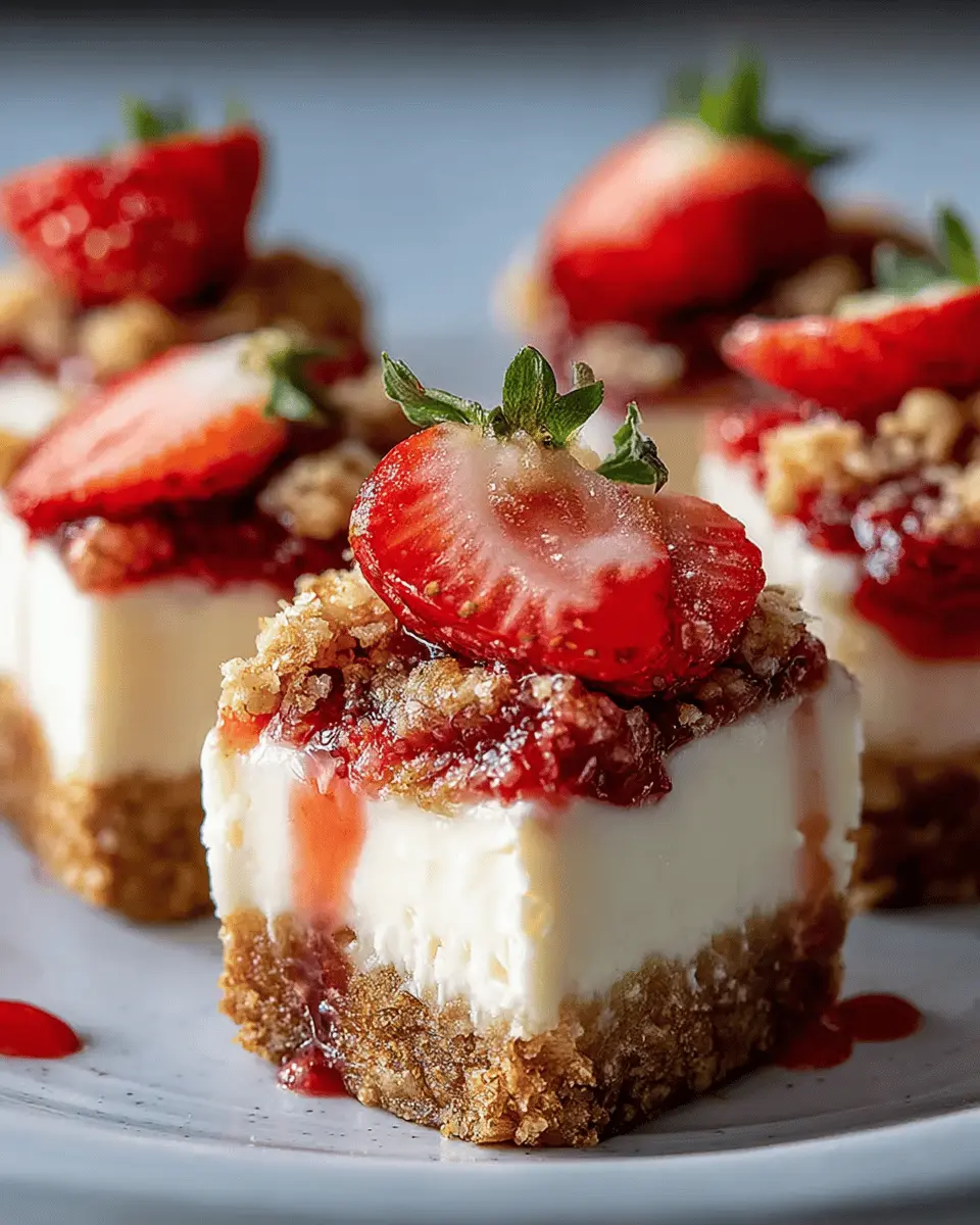 To assemble, cut the chilled cheesecake into bite-sized squares. Top each square with a spoonful of the macerated strawberries and sprinkle the graham cracker crunch on top. For an extra touch, consider adding a dollop of whipped cream.