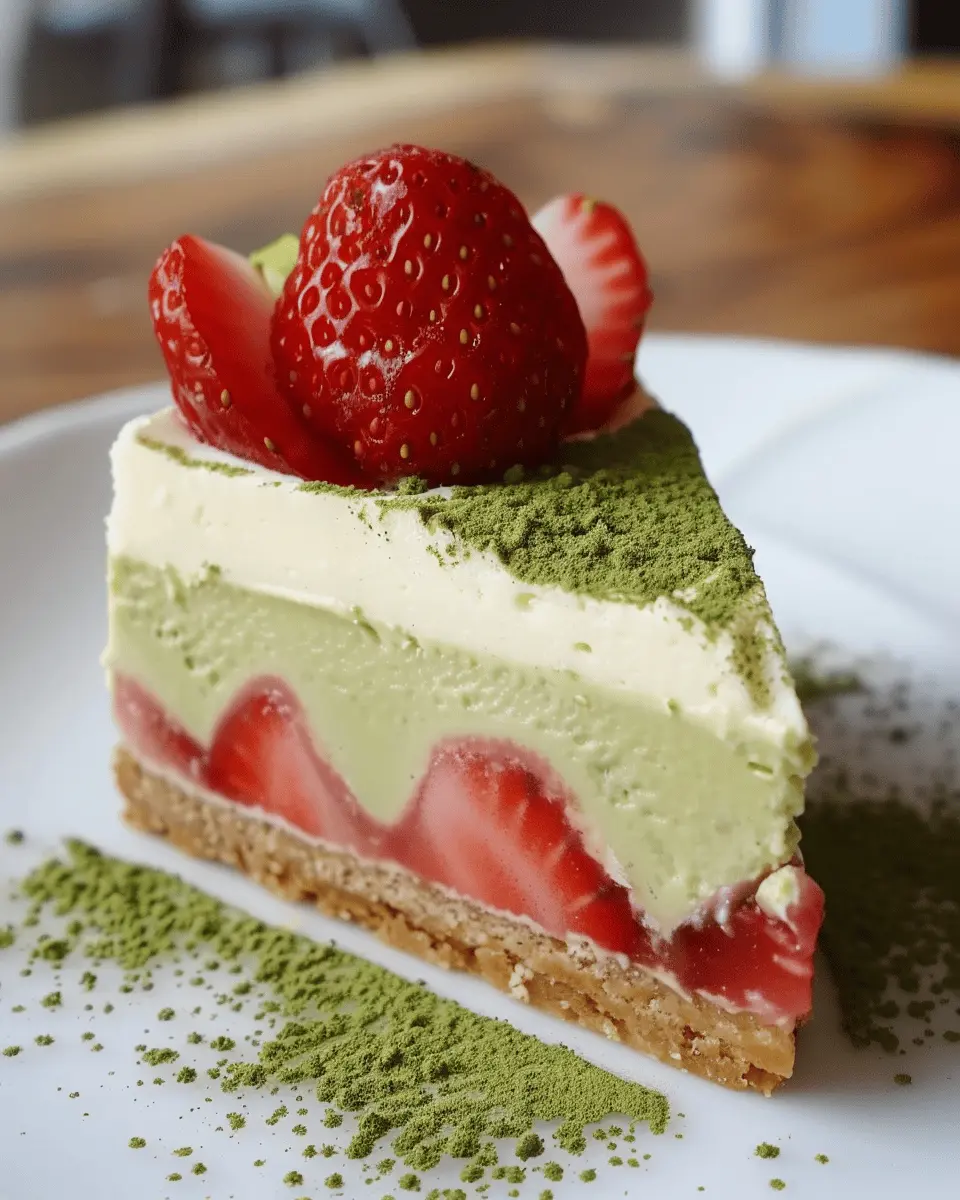 A delicious blend of flavors that combines the richness of cheesecake with the earthy notes of matcha and the sweetness of strawberries.