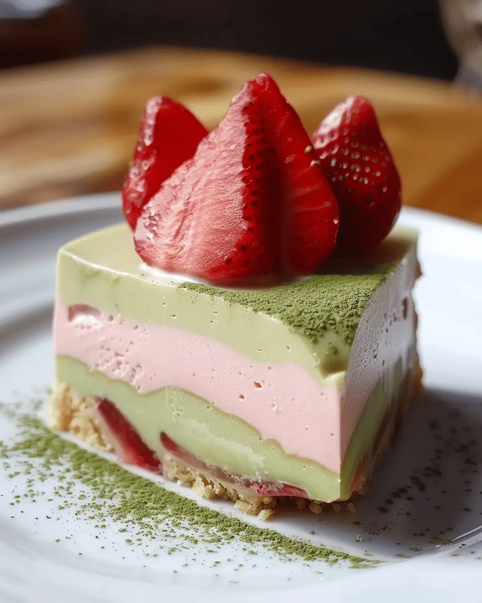 Each element harmonizes beautifully—soft, sweet strawberries and bold matcha swirl together in a dessert that looks as stunning as it tastes. The delightful green color, contrasted with the vibrant red of strawberries, is a feast for the eyes and makes any occasion feel extra special, whether it’s a cozy evening at home or a small gathering with friends.