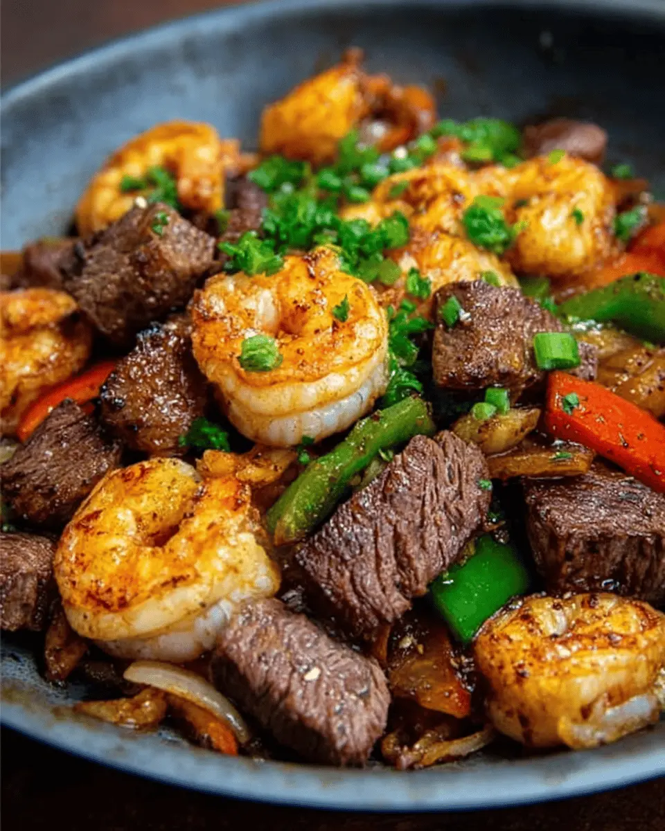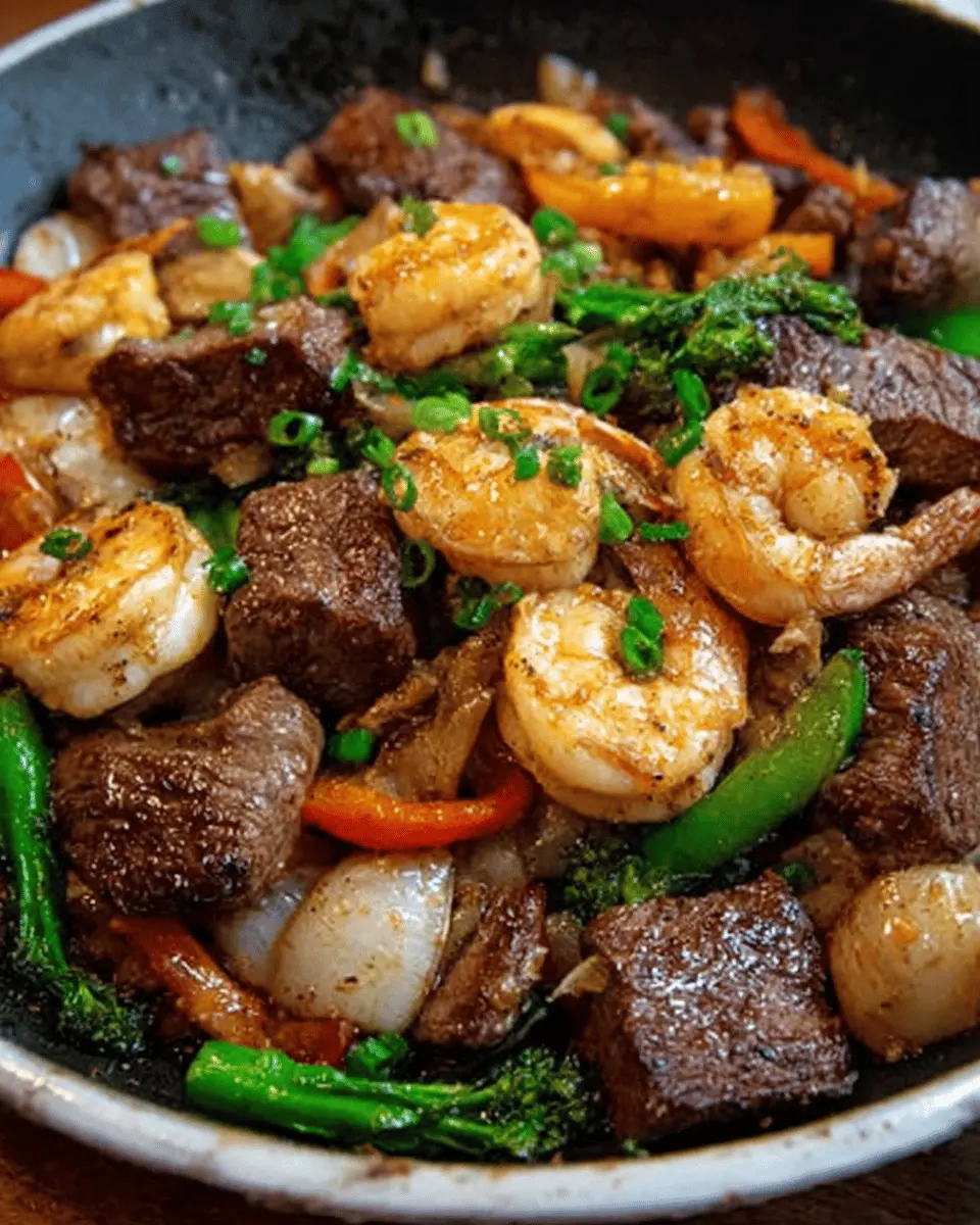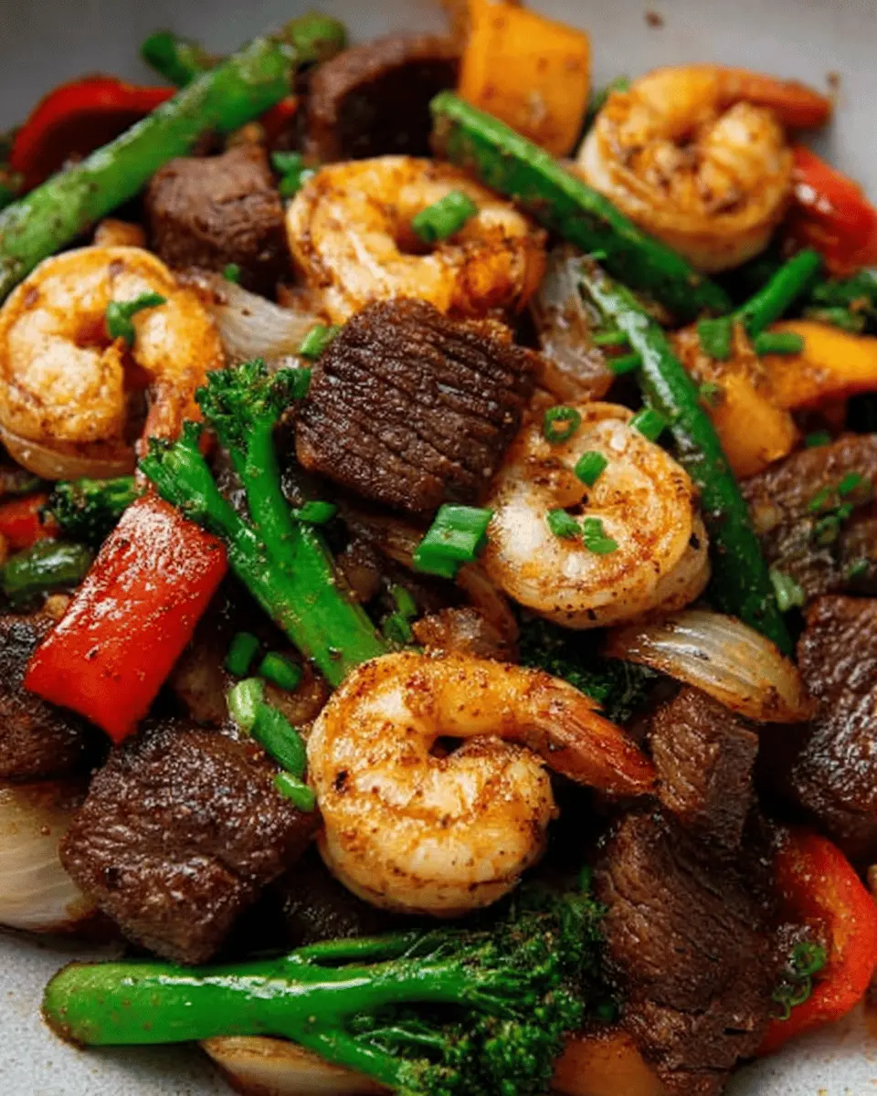 Using the same skillet, add another splash of oil if needed and toss in the shrimp. Cook them for about 2-3 minutes, just until they turn pink and opaque. Remember, overcooked shrimp can become rubbery, so keep an eye on them! After they’re done, remove them and set aside with the beef.