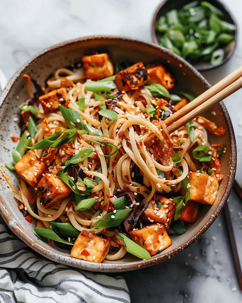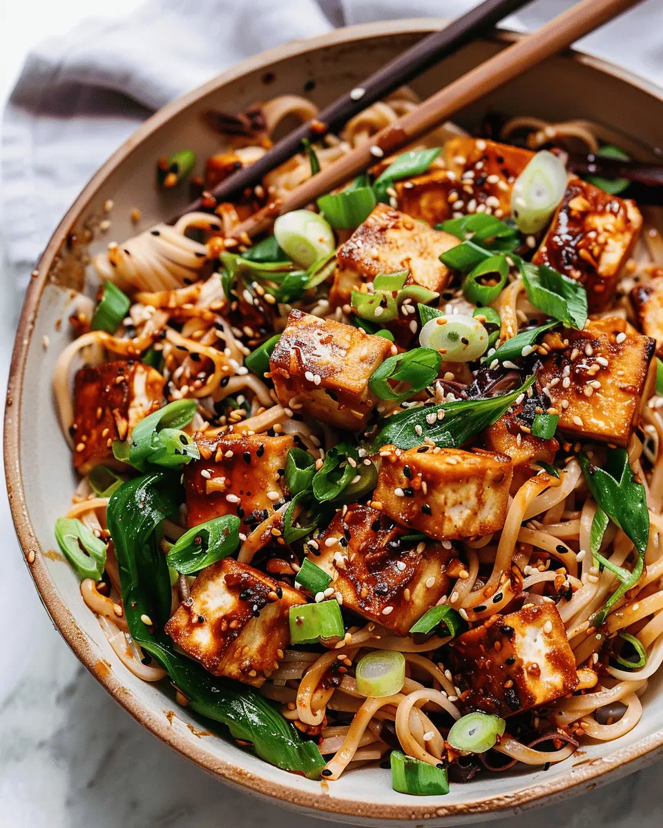 - Serve the noodles topped with crispy tofu and garnish with green onions and sesame seeds.