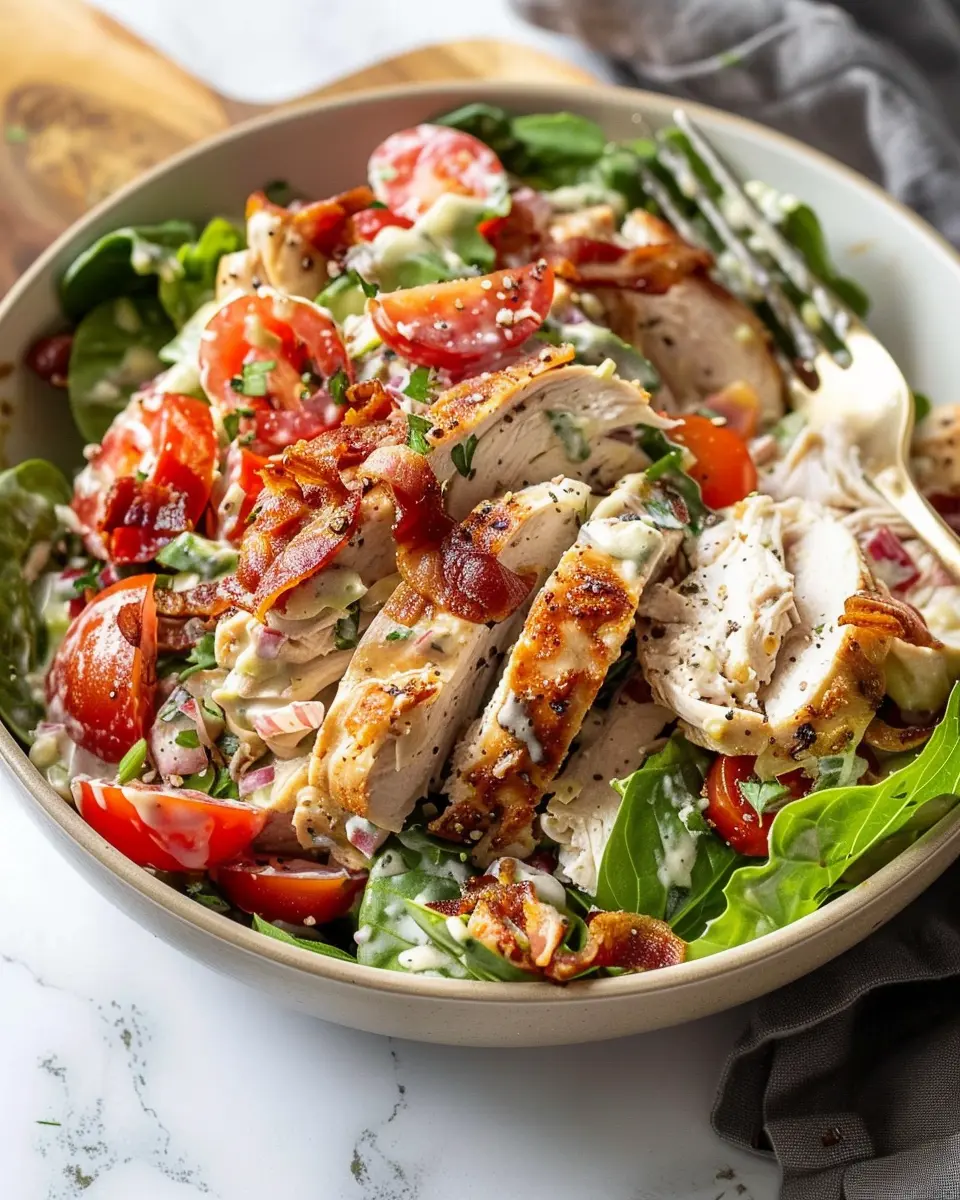 1. In a large bowl, combine the shredded chicken, crumbled turkey bacon, cherry tomatoes, romaine lettuce, red onion, and avocado.